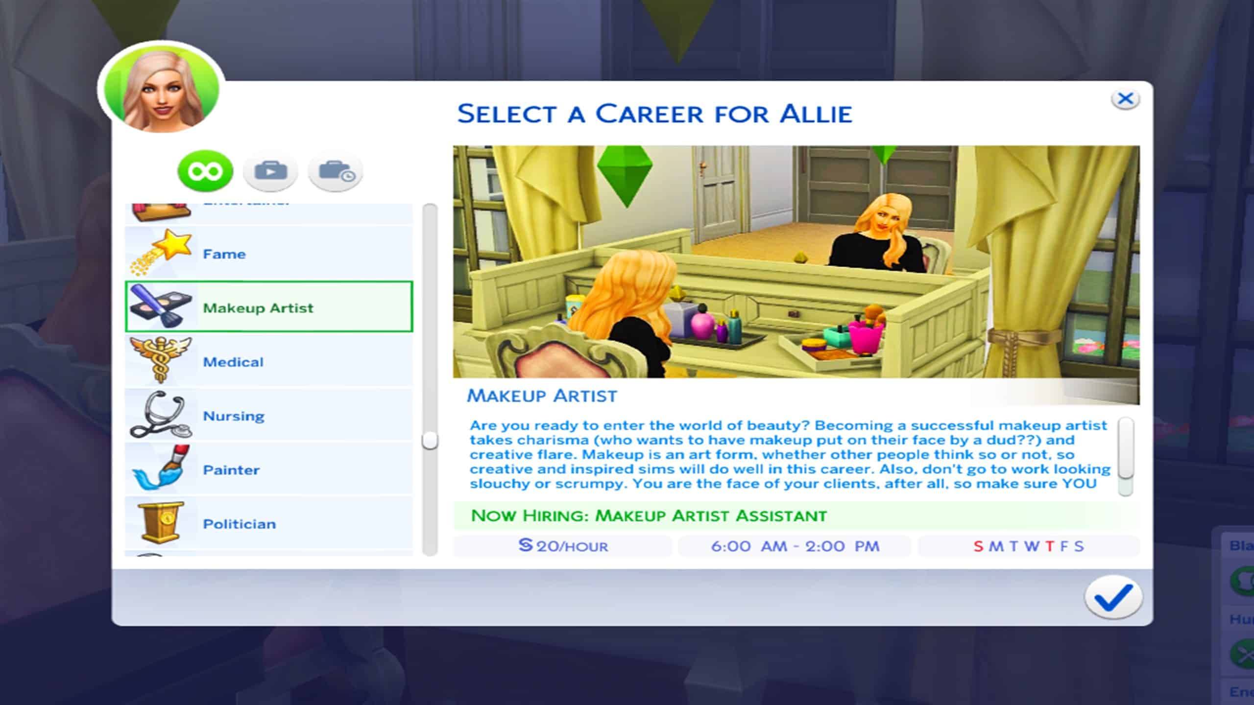 Editorial Makeup Artist An editor at Sim Vogue was watching one of your shows and was so impressed by your work, she reached out to you through Simstagram. Next thing you knew, you were sitting in an interview being offered a fantastic job doing makeup for all of the celebrities being featured in her magazine! The fashion is so inspiring you’re able to try out more daring makeup, and it turns out you’re great at it! Keep up the networking and you’re career could get even farther!
