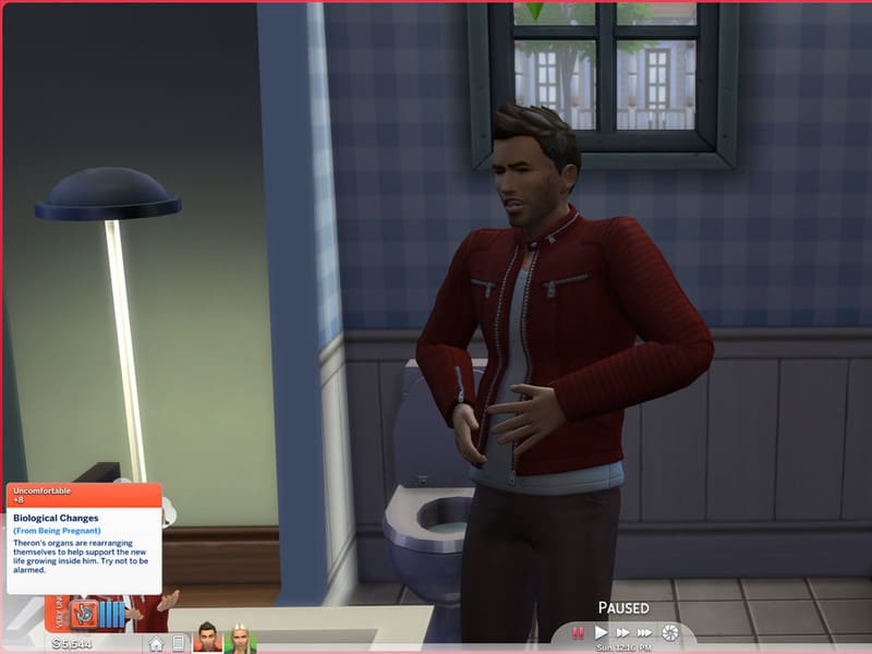 While the trait is called Male Pregnancy, I’ve done my best to make it transgender friendly. Rather than using male/female as my test condition, I’m using pee standing up/can be impregnated, although many of the moodlets use he/him as pronouns. Please make sure to select “Can be impregnated” and “Use toilet standing” during CAS character creation to ensure this trait functions as intended. It will also work for male Sims who have been abducted by aliens. I do not intend to re-create this trait for women.