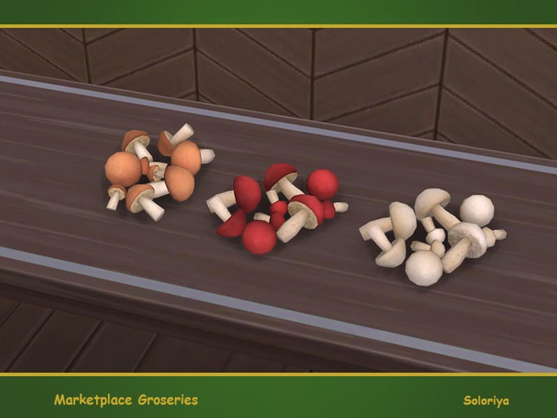 Nine decorative mushrooms in one mesh. Part of Marketplace Groceries. 3 color variations. Cagetory: Decorative – Clutter.