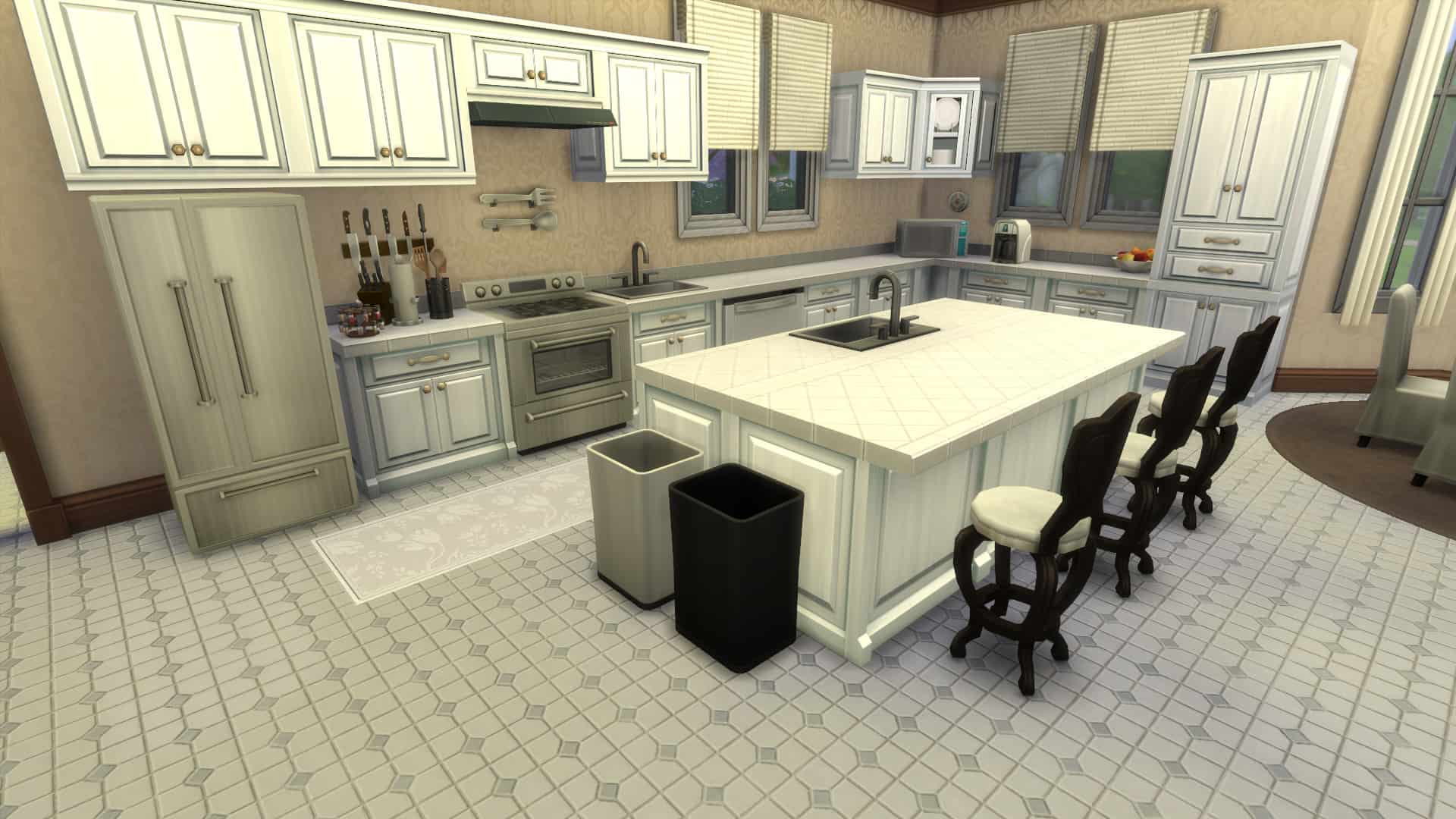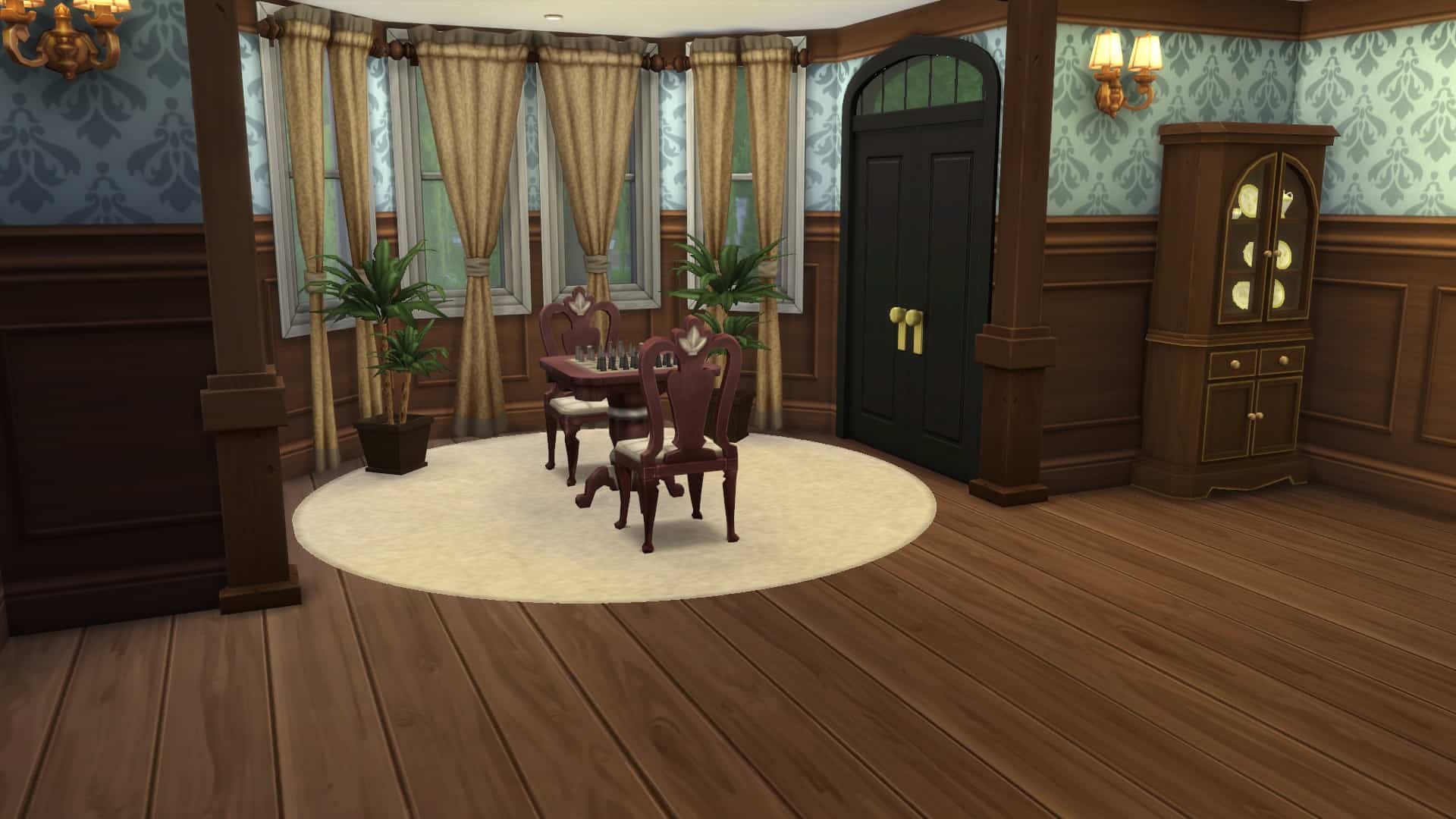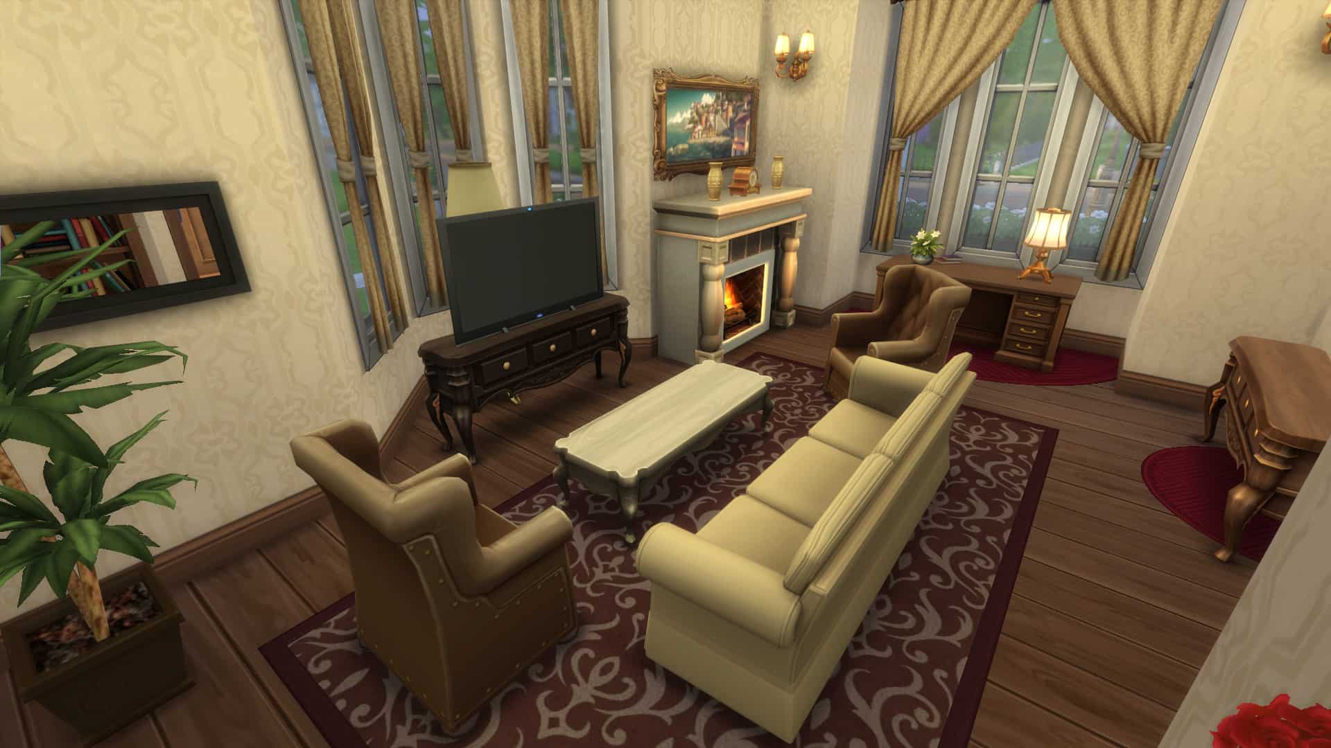 Differences in the old v new include a new, expanded front, a new roof-line, a slightly modified floor plan, brand new furnishings throughout, and a smaller, though better-landscaped yard. And, despite having (what I perceive to be), better interior furnishings, this home is actually about 50k cheaper than the first version! I think this is the first time I uploaded a “new” version of an old house that ended up being less expensive than the previous one. Also, in keeping with the spirit of the first home I made sure to keep this house completely BASE GAME ONLY! I also tried to furnish the house with as little MOO as possible although I did have to make some concessions.