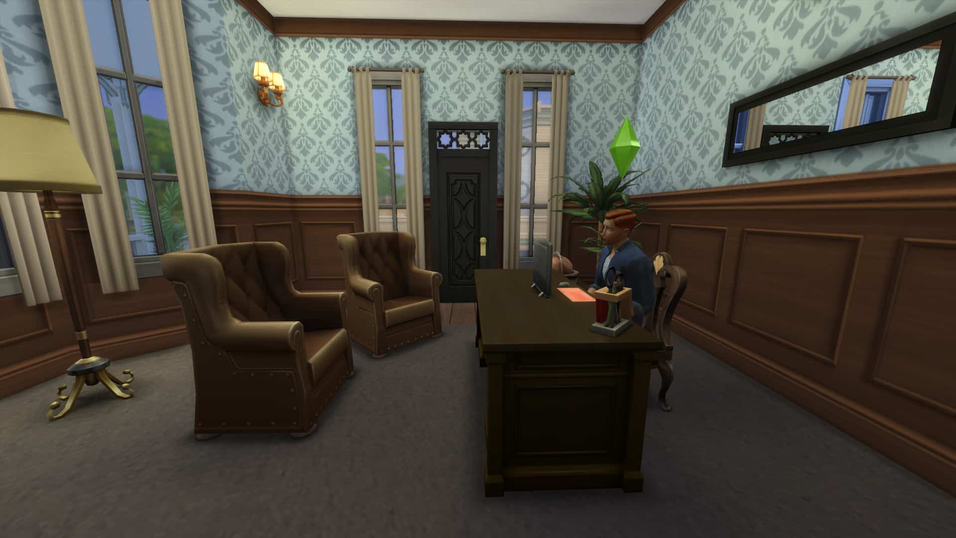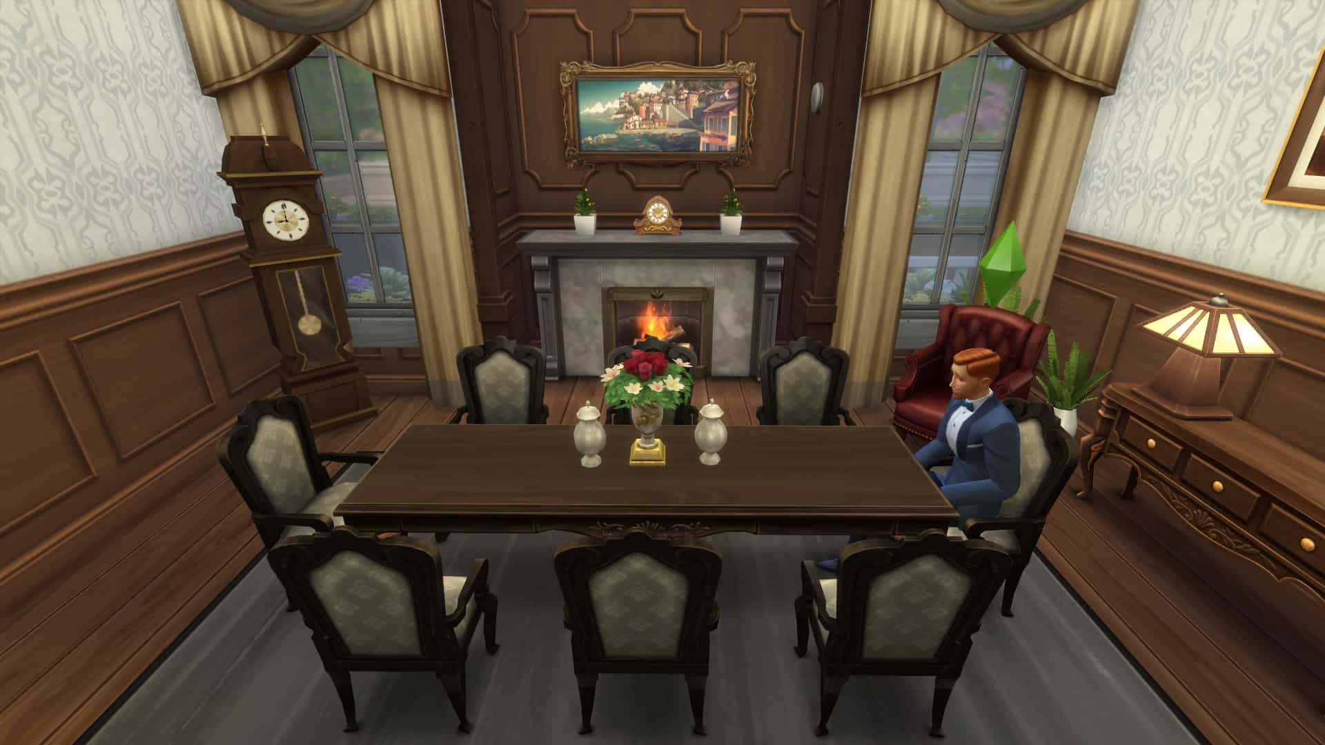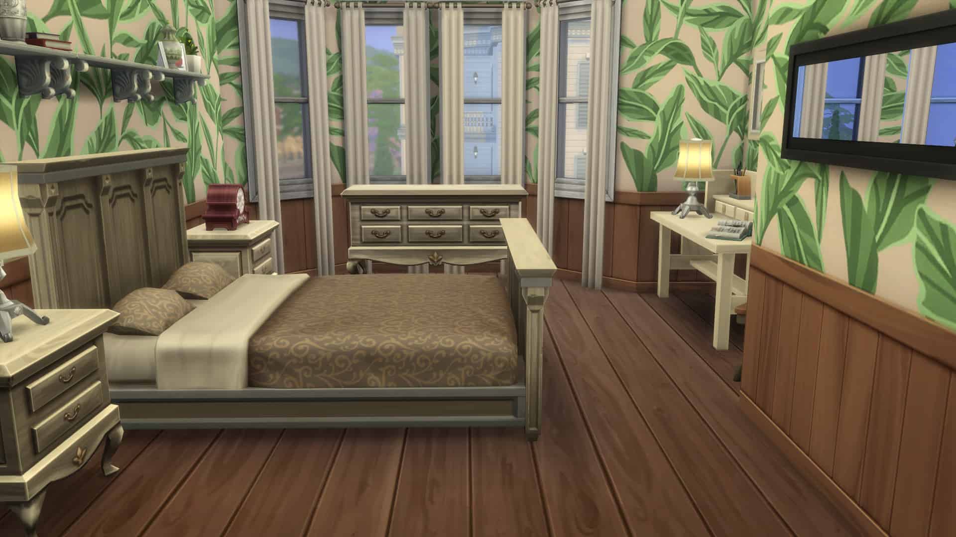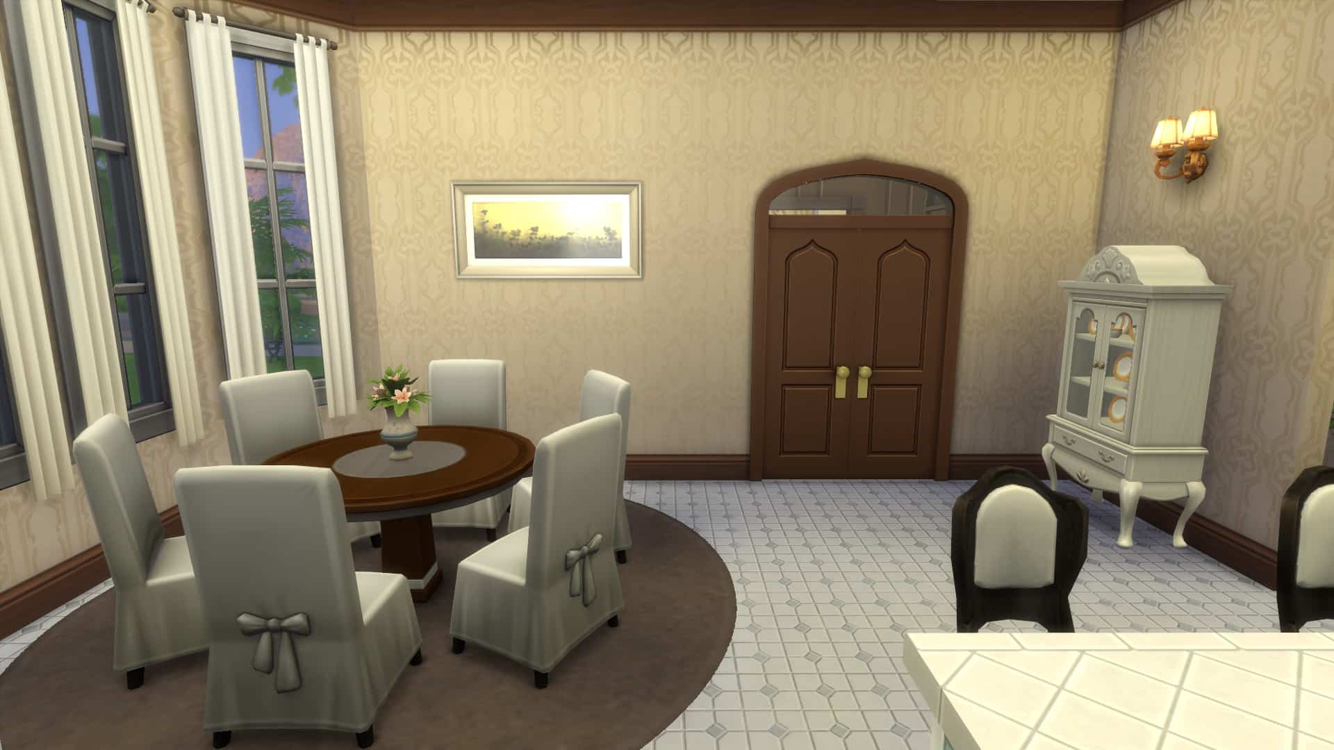 Differences in the old v new include a new, expanded front, a new roof-line, a slightly modified floor plan, brand new furnishings throughout, and a smaller, though better-landscaped yard. And, despite having (what I perceive to be), better interior furnishings, this home is actually about 50k cheaper than the first version! I think this is the first time I uploaded a “new” version of an old house that ended up being less expensive than the previous one. Also, in keeping with the spirit of the first home I made sure to keep this house completely BASE GAME ONLY! I also tried to furnish the house with as little MOO as possible although I did have to make some concessions.