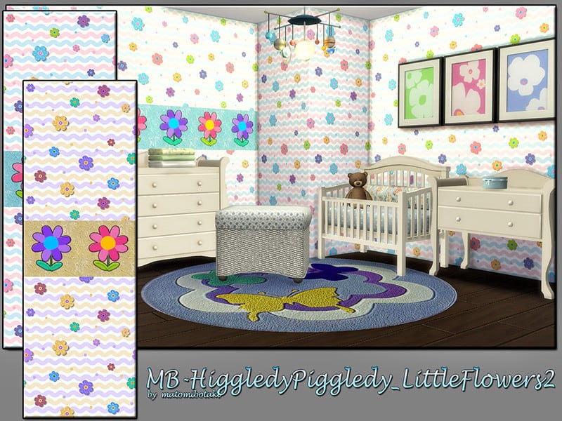 Lovely wallpaper for the little once with tiny flowers and waves, partly with middle, painted border, each item comes in 2 color shades and 3 wall hights, with custom thumbnail, part of the – MB-HiggledyPiggledy_LittleFlowersSET – created for Sims 4, by matomibotaki. ONLY BASEGAME NEEDED