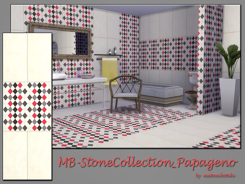 Tile wall with large beige ceramic tile and decorative rhombus middle part, comes in 3 wall hights and custom thumbnail, part of the – MB-StoneCollection_PapagenoSET – matching 3 tile walls and 2 floor tilem, created for Sims 4, by matomibotaki.