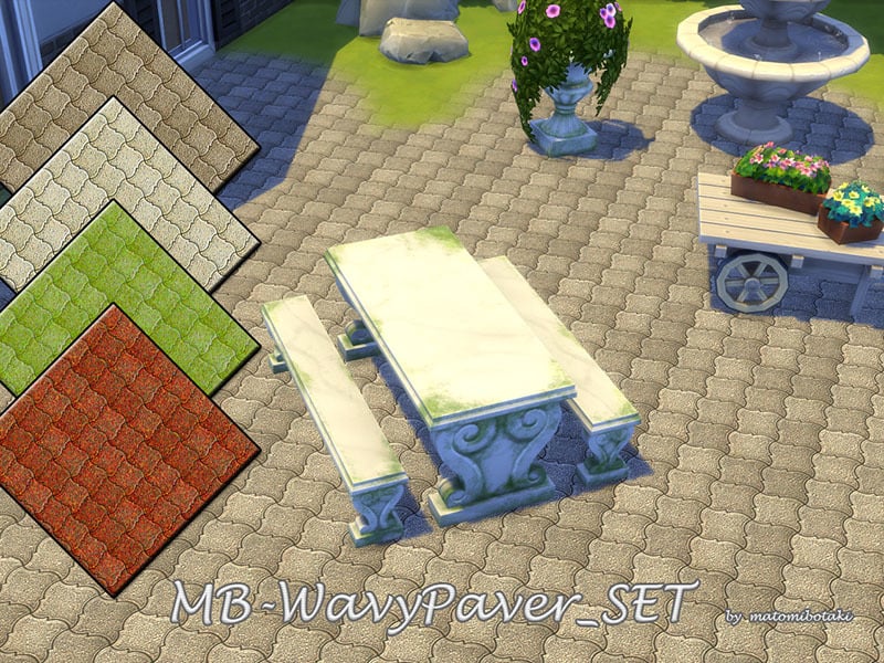 4 new terrain paints with wavy stone paver in different color shades, each with custom thumbnail included, only basegame needed, created for Sims 4, by matomibotaki.