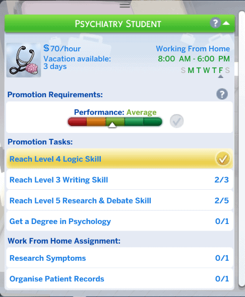 The career has 2 levels before branching out to one of three branches: GP, which has an additional 4 levels; Psychiatrist, which has an additional 4 levels; and Surgeon, which has an additional 5 levels. There are 7 work from home assignments available for the first two levels should you wish to use them and there are no daily tasks. There’s also 6 work from home assignments for the Surgeon branch, 5 for the Psychiatrist branch and 6 for the GP branch. Many of these assignments require the Doctor Interaction mod by Cepzid. It’s a lovely little mod and I highly recommend grabbing it. There are no daily tasks. Finally, there are uniforms for all levels!