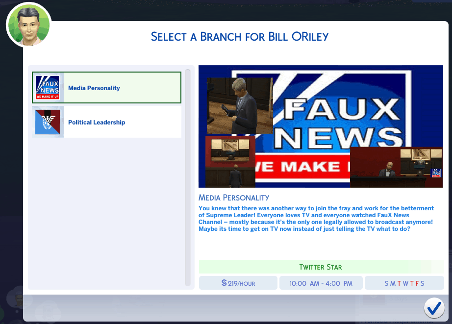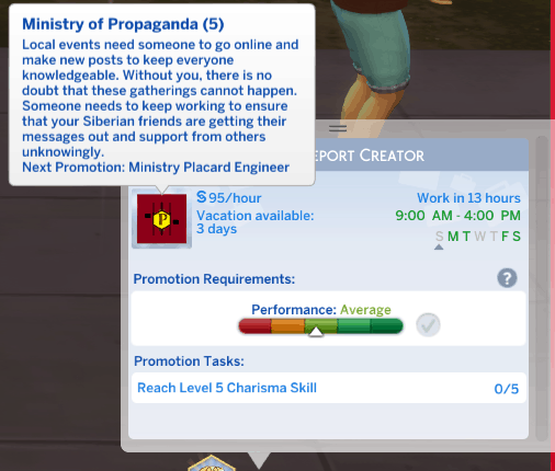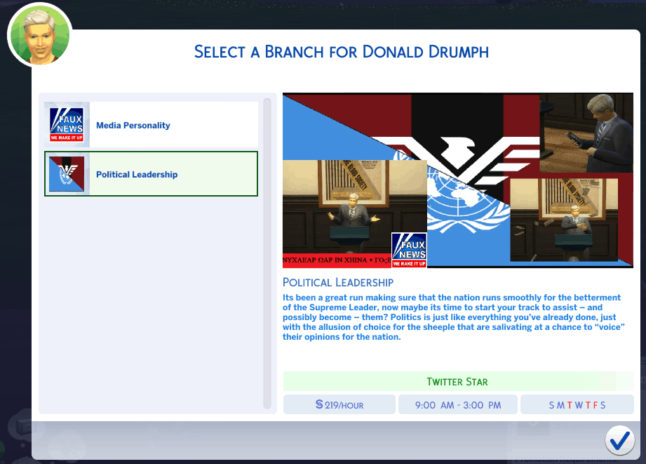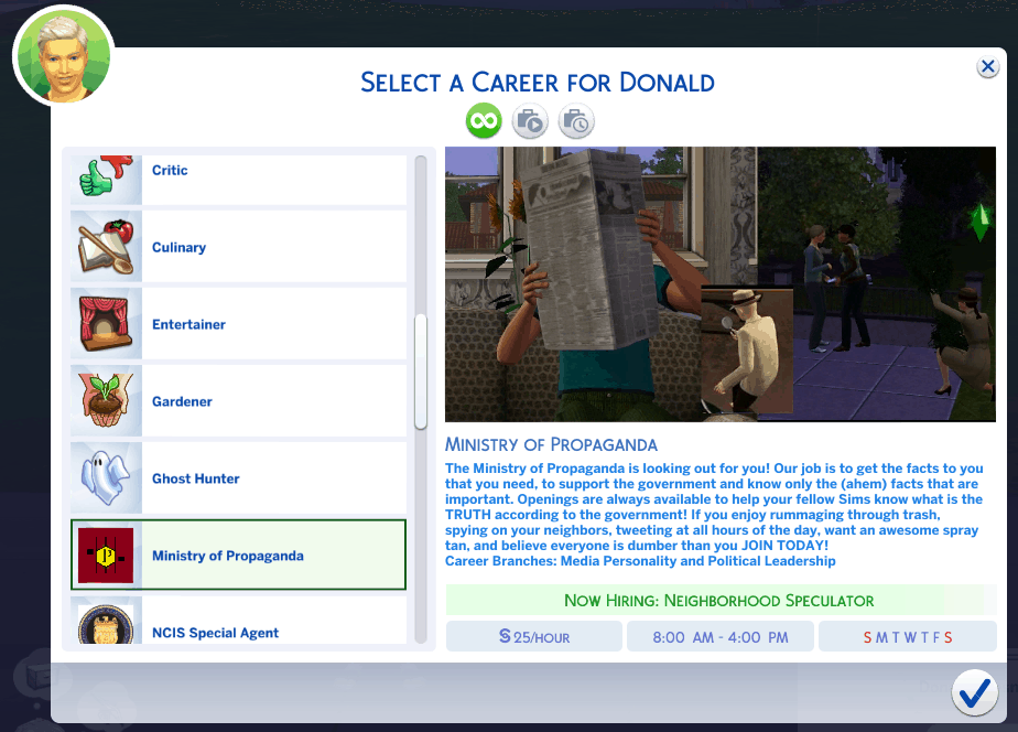 The Ministry of Propaganda is looking out for you! Our job is to get the facts to you that you need, to support the government and know only the (ahem) facts that are important. Openings are always available to help your fellow Sims know what is the TRUTH according to the government! If you enjoy rummaging through trash, spying on your neighbors, tweeting at all hours of the day, want an awesome spray tan, and believe everyone is dumber than you JOIN TODAY!