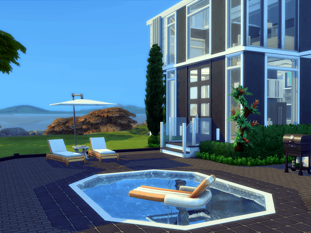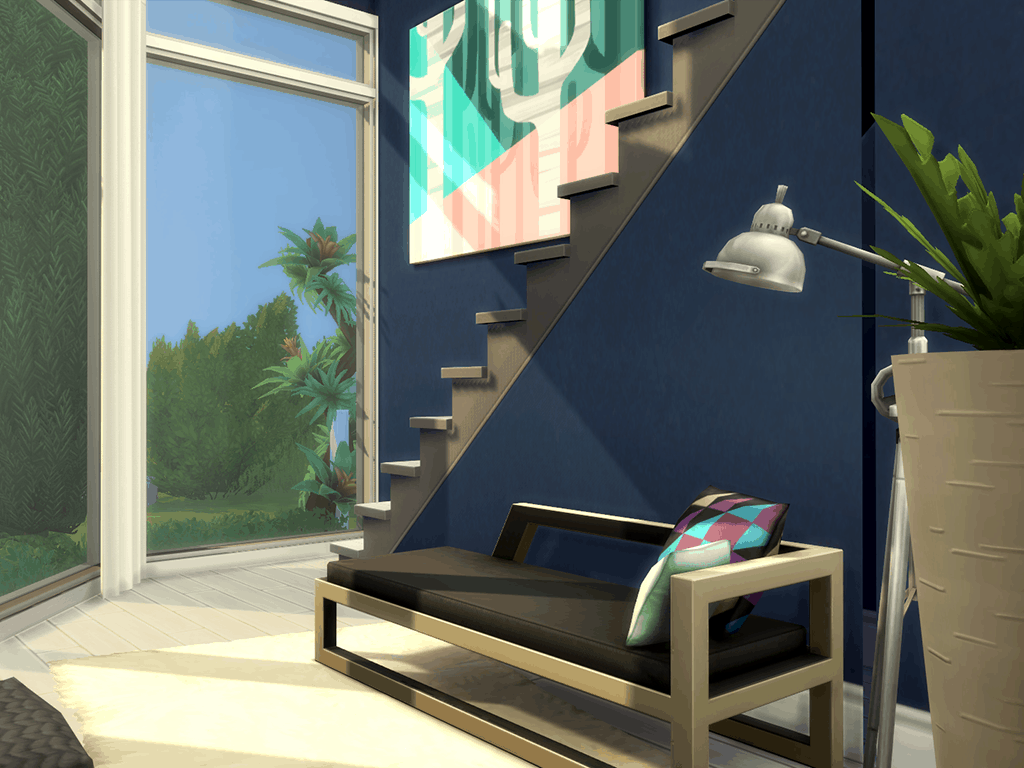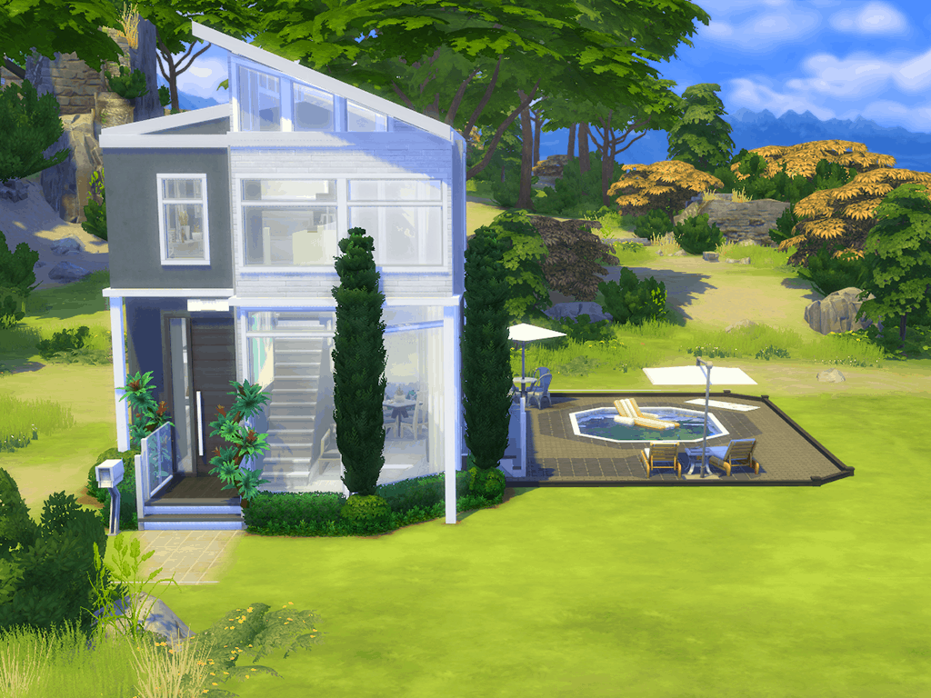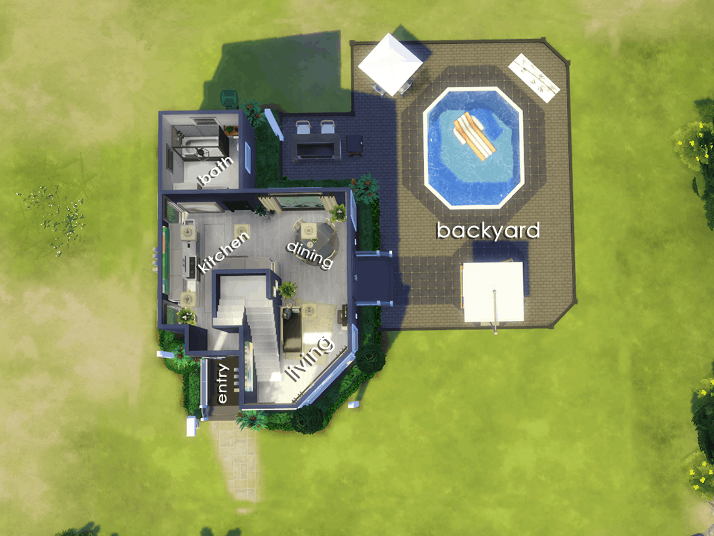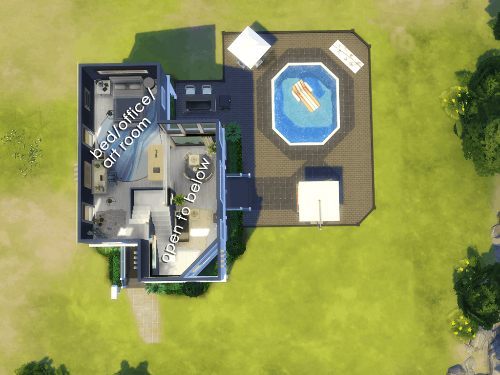 This build has one bathroom and one bedroom with a finished side yard and an office and creative space. This build also uses CC from Peacemaker.