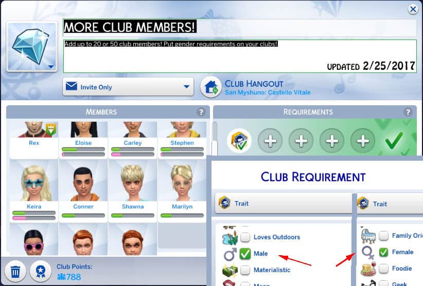 At popular request, I have created two additional files for this mod, one for a 20 member club and one for a 50 member club. These new _Gender_ files will allow you to put gender requirements on your clubs, large or small. These files are all standalone. Only install one of the EL_MoreClubMembers_ packages!