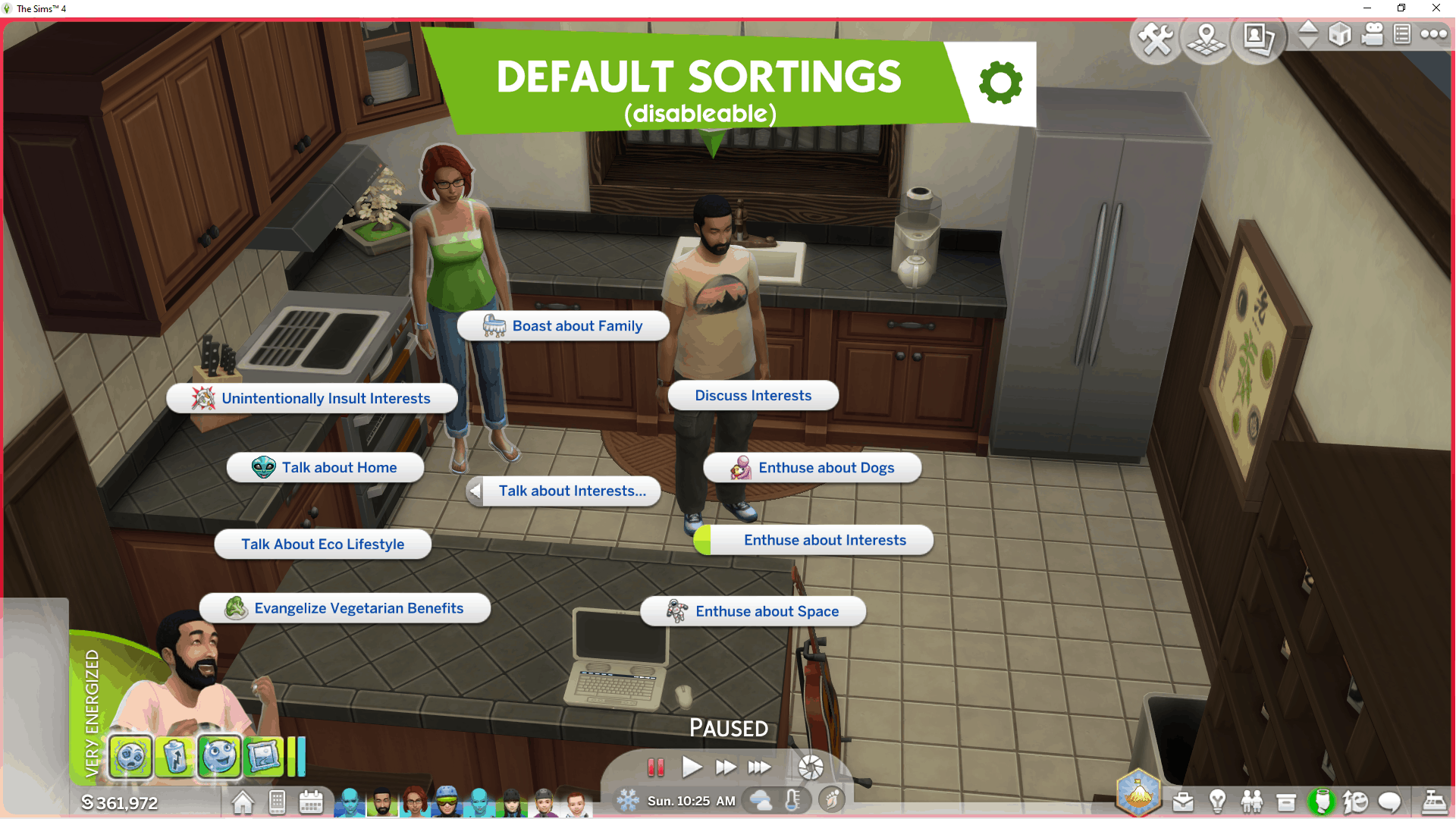The mod’s default sortings are there to help. They are supposed to be a head start to make you spend less time organizing every single interaction in the game. But if the way you want to organize your interactions is fundamentally different and you feel like it will take you more time with the default sortings than without, you can disable them with this cheat cLineLy.enable_default_sortings False. Using True will re-enable them.
