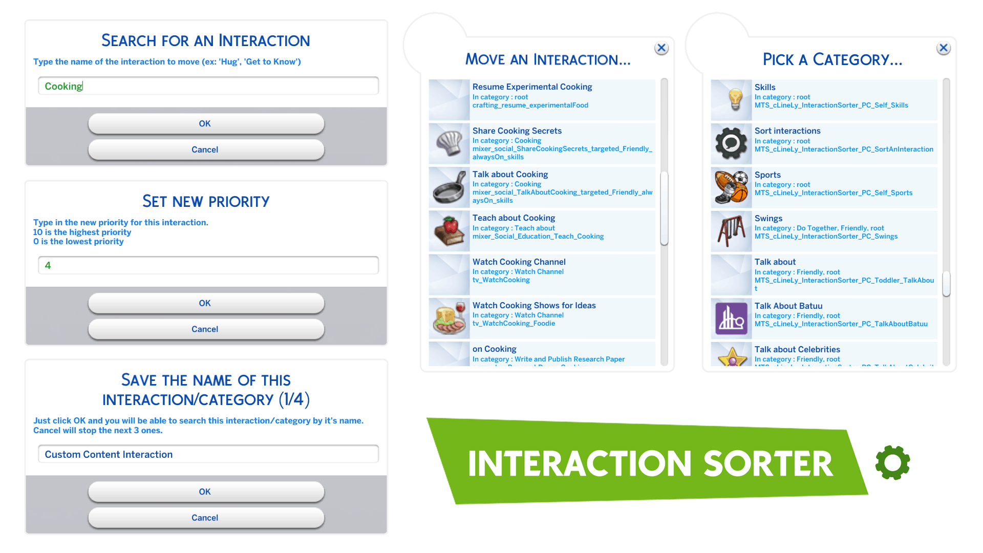 That’s because the search system of this mod also searches through every interaction’s “hidden name”. For example, the hidden name for “Ask about Day” is “mixer_social_AskAboutDay_targeted_Friendly_alwaysOn”. Now, let’s say that “Ask about Day” is from an upcoming pack. If you searched for “Ask about Day”, you would still find what you were looking for because “Ask”, “Day” and “About” are all inside its hidden name. But if you searched for “Become Best Friends” you would not find the interaction, because its hidden name is “mixer_social_AskToBeBestFriends_targeted_Friendly_HighScore” and “Become” is not in it. If you only typed “Best Friends” then you would find it.