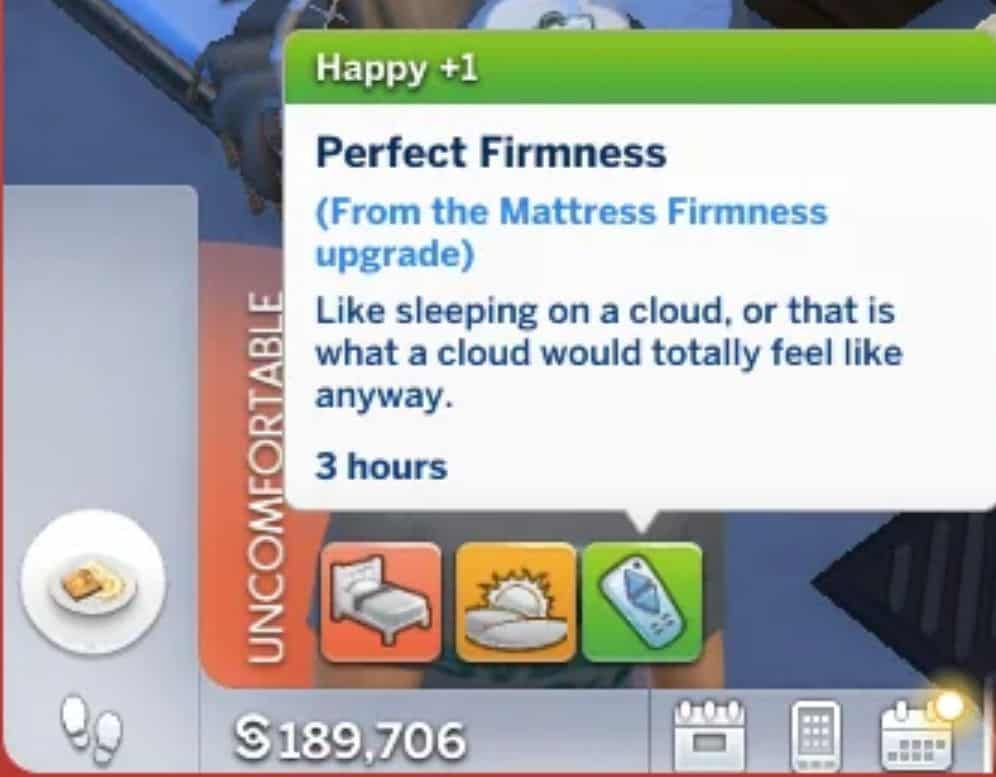 And then there’s also the Mattress Firmness upgrade for your bed (requires lvl 8 handiness), which will make your sim feel “like sleeping on a cloud”. However, contrary to my understanding of logic, they are not mutually exclusive. Aka you can get them at the same time, from the same sleep, in the same bed. I think it’s ridiculous.