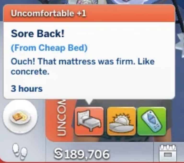 So, there’s this “Sore Back!” moodlet which your sim has a 10% chance of receiving after sleeping in a cheap bed.