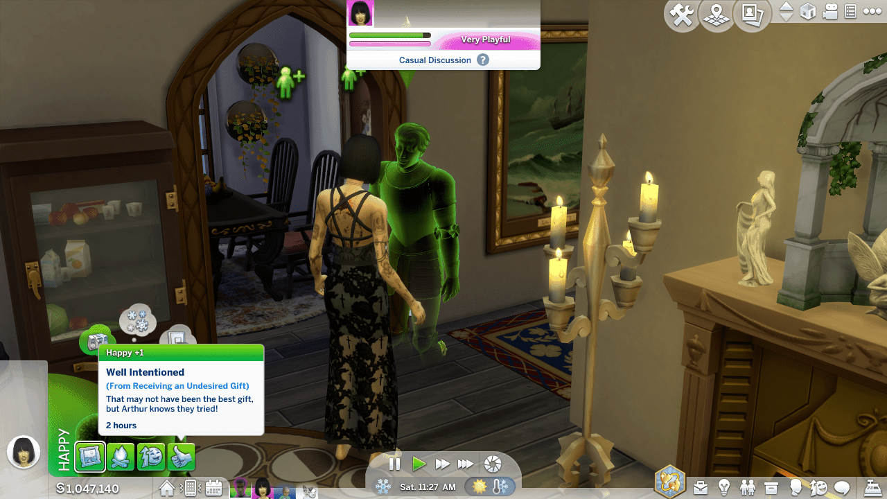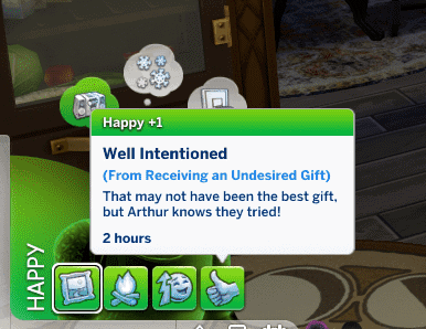 When disliked gifts are received, the person giving the gift will no longer receive a sad “Useless Gift” buff, in fact, they won’t receive a buff at all. Instead, the person receiving the gift will receive a small ‘Happy’ moodlet called “Well Intentioned”. Both sims will also gain a small amount of relationship from these “Well Intentioned” gifts, friendship for friendly gifts and romance for romantic gifts.