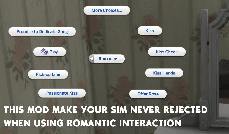 Tired when your sim always rejected by other sim when using romantic interaction. Don’t worry, I just open your solution, and yes, your sim never rejected again by her/him when if you put this mod in your mod folders. Example, darling walsh, lily feng, and raj rasoya are unflirty, they always reject any romantic interaction or being gross with romantic. And j huntington iii and don lothario are Noncommittal sims, usually always reject your propose. But this mod, every sims will be accept any romantic interaction, include unflirty sims accept romantic interaction, and Noncommittal sims accept “propose”. Hope you like and sorry for my english writte. I’m still learning