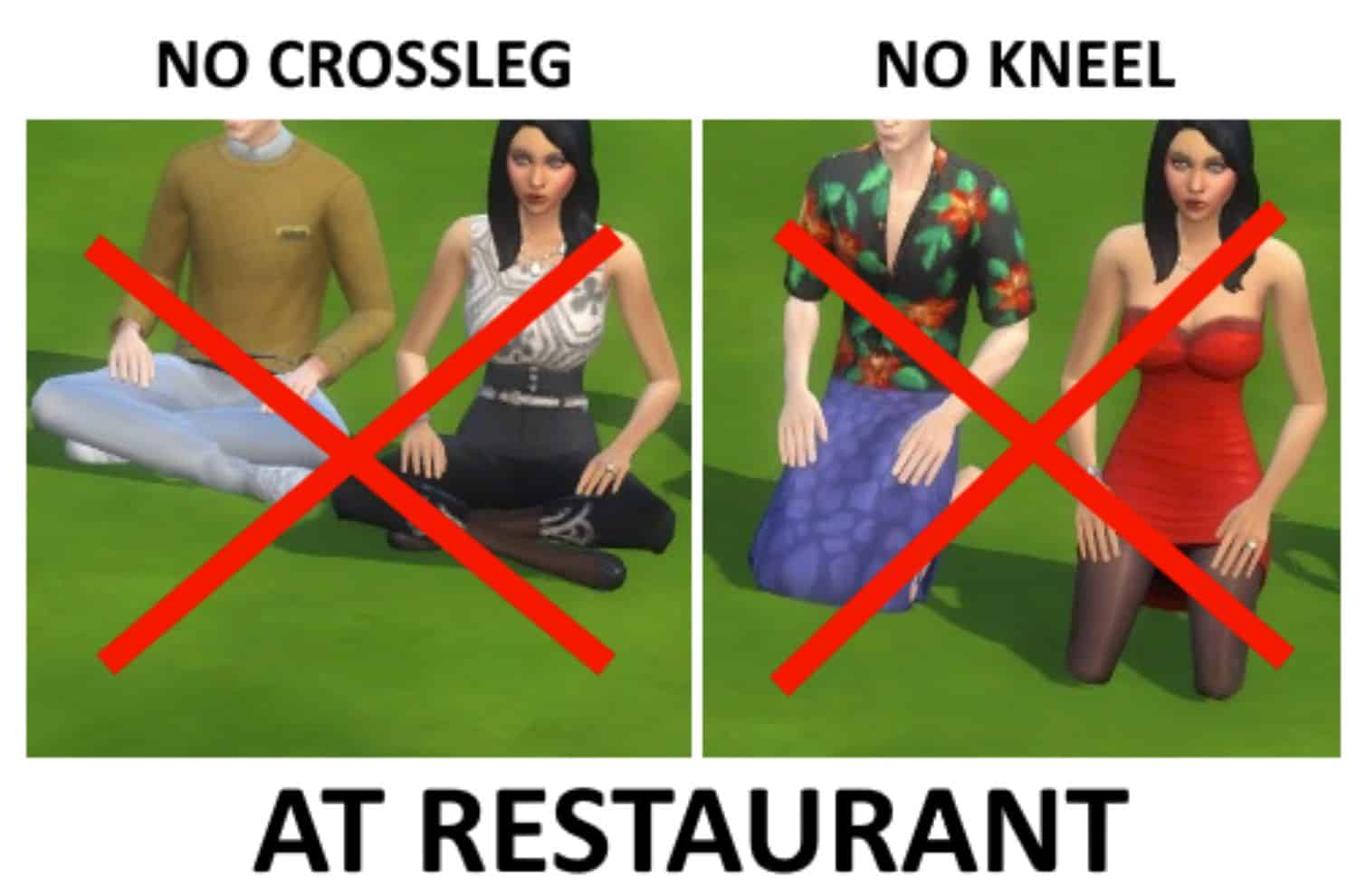 I find it really annoying when your sims go to the expensive gourmet restaurant and behave really inappropriate and ridiculous constantly tending to sit on the floor to talk to someone right in their formal outfit obsessively. After multiple tries to find a mod that prevents it, I decided to try make it myself.