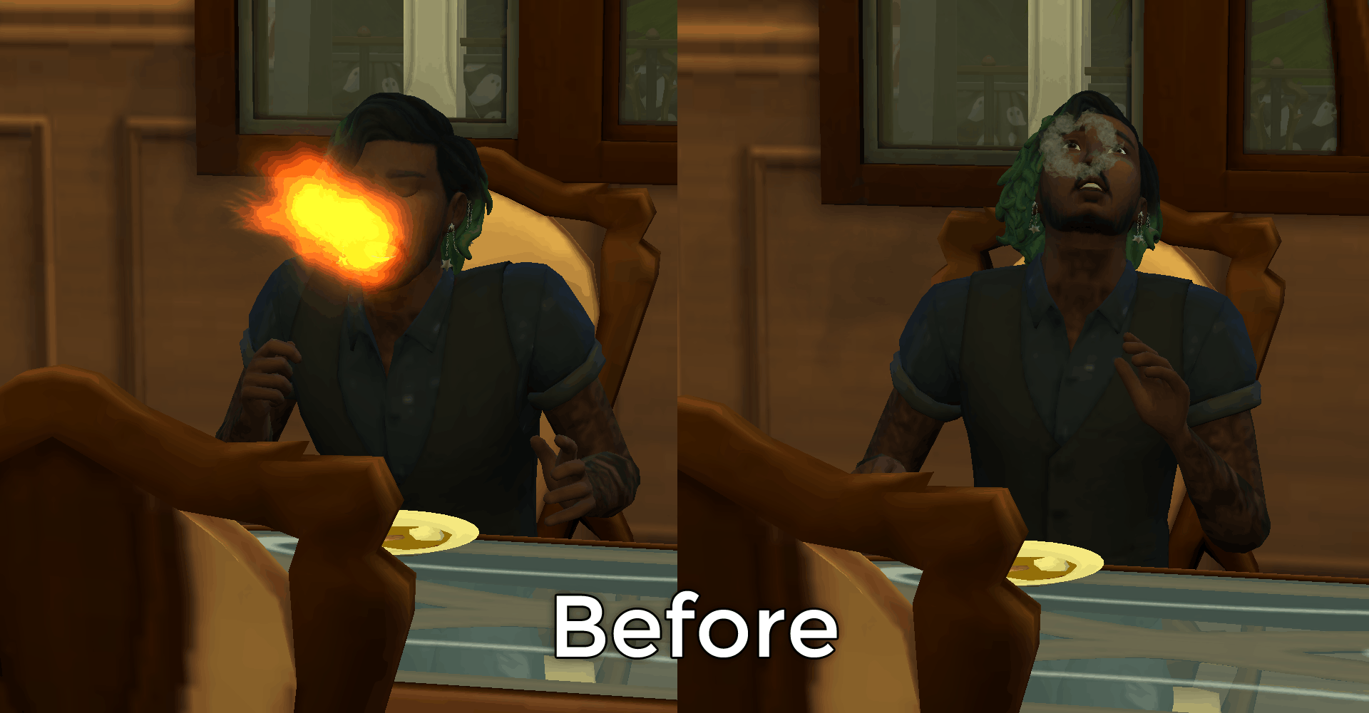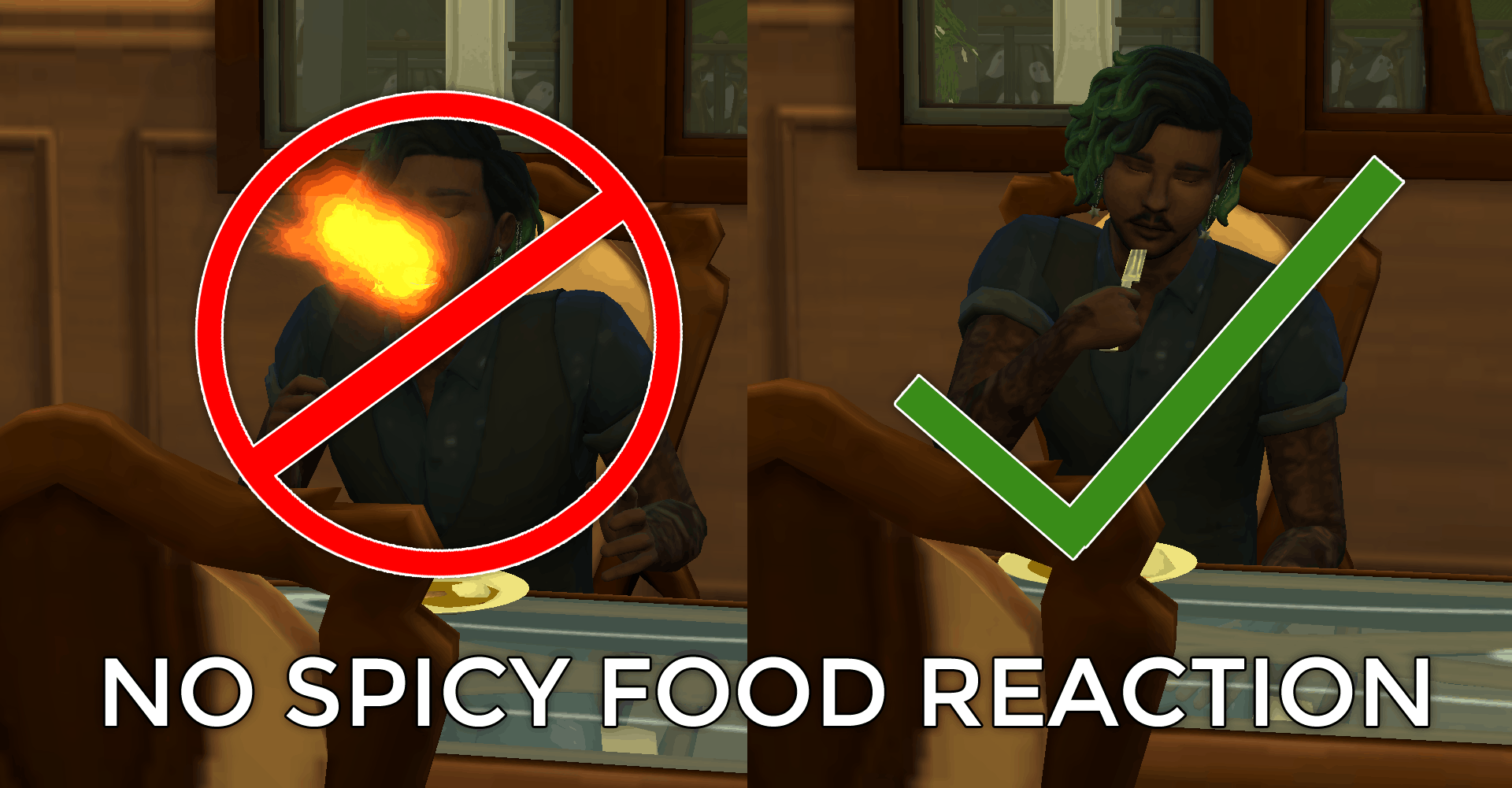 This may not be something other people want but I figured I’d upload it in case they do, but much like the brain freeze animation I got tired of my sims always panicking if they eat spicy food and they’re not used to it. It often slowed down my gameplay as I’d find they’d do it every time they took a bite and I’m very impatient. So what I did was create a wee tuning mod where I got rid of it! This should completely remove any reaction to spice your sim might have, so if you want a toned down version but you really like the animation in moderation, this isn’t your mod (though I may add a version like that in future).