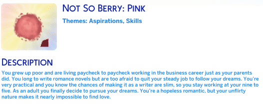 * For Rose, ‘get married for the first time as an elder’ has no specific goal attached to it, since I cannot currently find a way to give the primary sim that caveat without leading to a game crash. The same also applies to marrying a Neat Sim for Grey; that’s reduced to just marrying a Sim. (‘Marrying a coworker’ for Peach, the game can handle. Don’t ask me how.)
