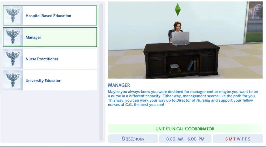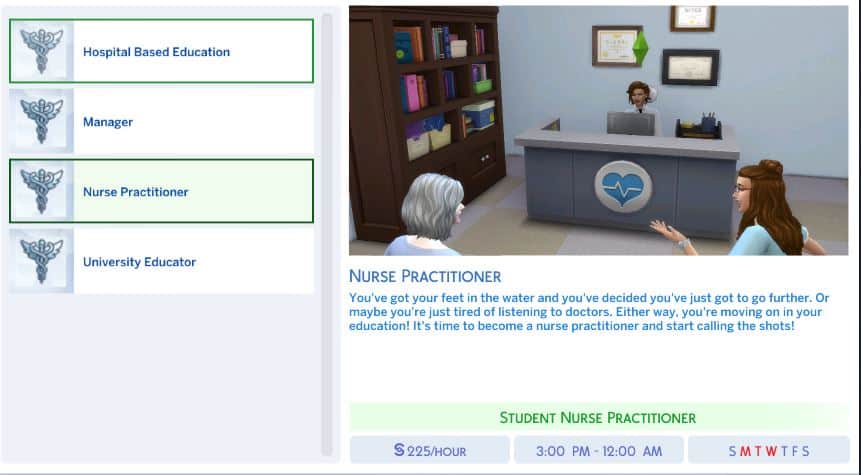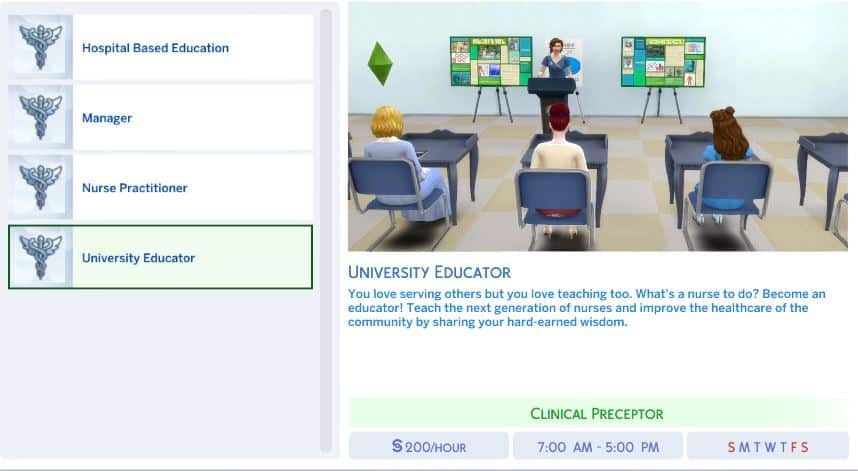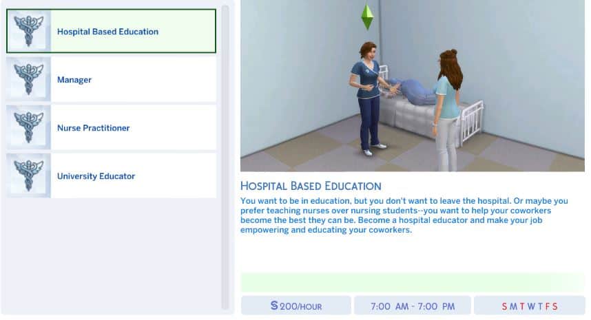Start out as a PCA (Patient Care Assistant) I and work your way up to Charge Nurse, then choose one of 4 tracks to advance your career further! www.sims4modhub.com. Become the Dean of Nursing at the local college, Director of Nursing or Chief Hospital Educator at Cornelia Goth Memorial Hospital, or become and Independent Nurse Practitioner! Each track ends at a total of 9 levels.