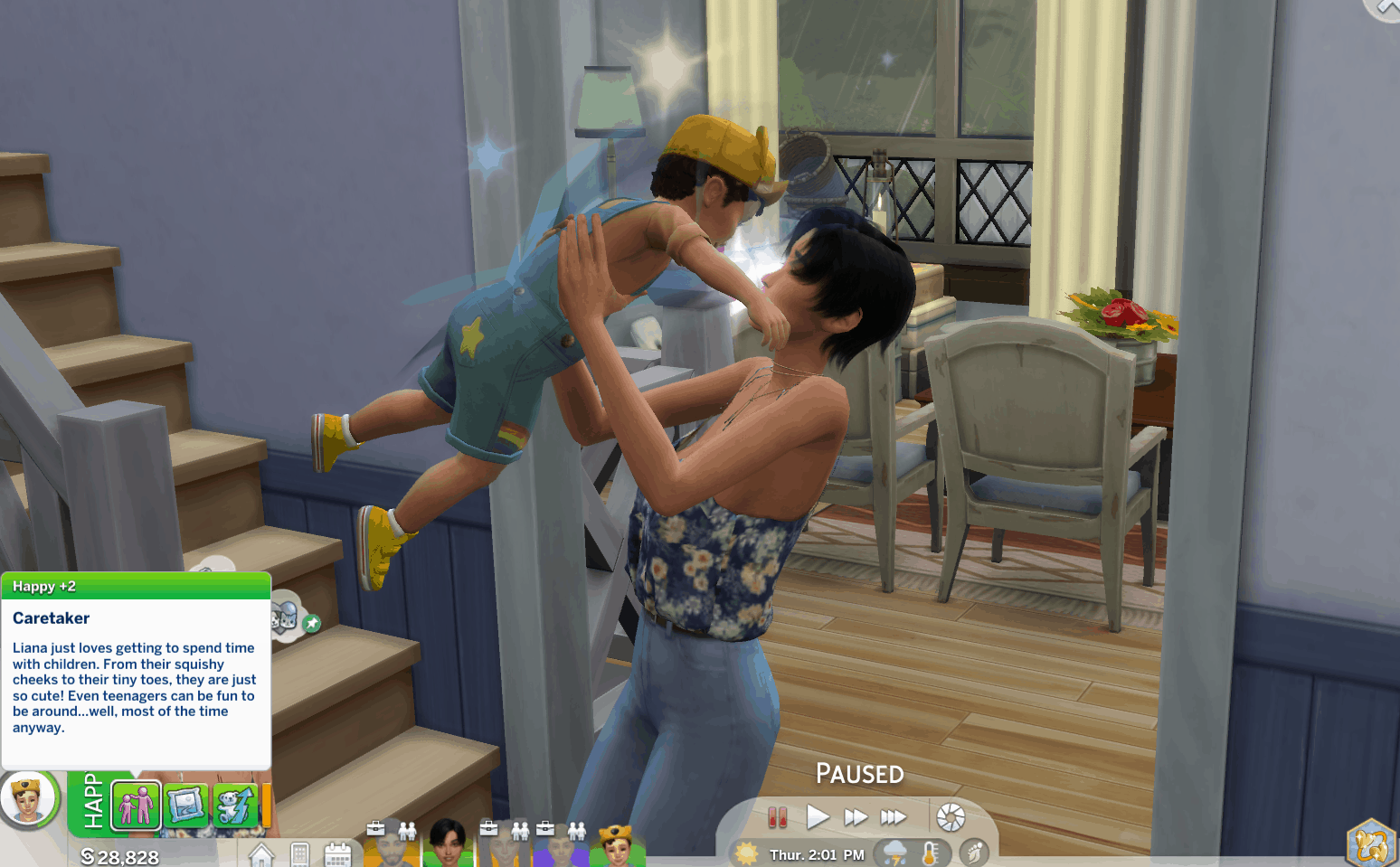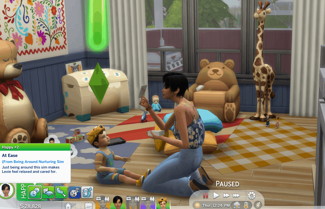 Toddler, child, and teen sims will get this +2 Happy buff when around a nurturing sim with the Caretaker buff.