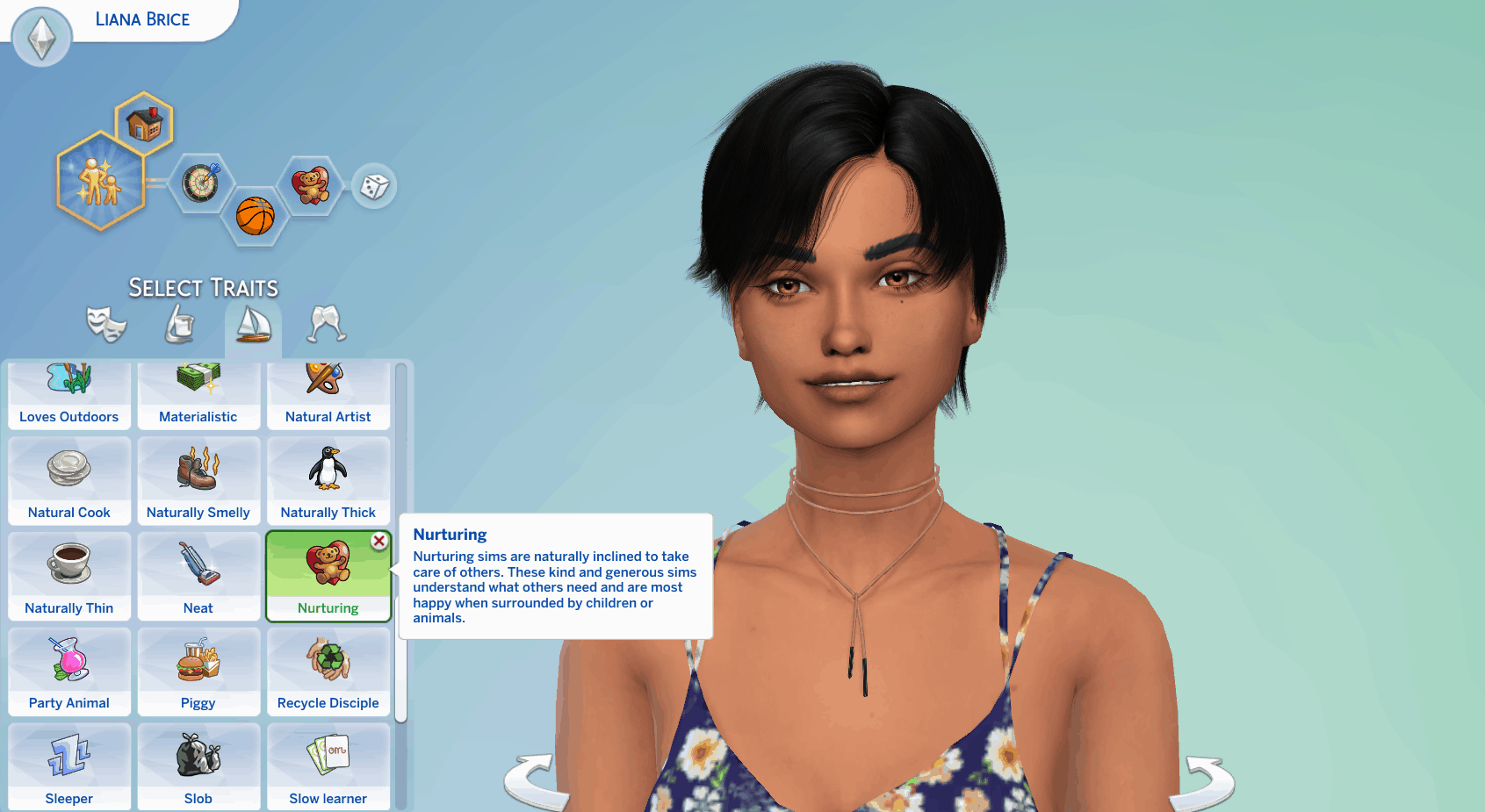 Nurturing Trait: Nurturing sims are naturally inclined to take care of others. These kind and generous sims understand what others need and are most happy when surrounded by children or animals. This trait is located in the Lifestyle category.
