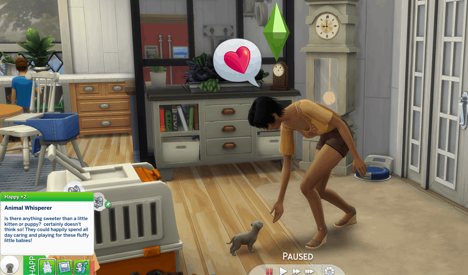 Sims will receive this +2 happy buff when around cats or dogs. While this buff is active they will gain friendship with animals more quickly and their pet training skill will be boosted by 2.