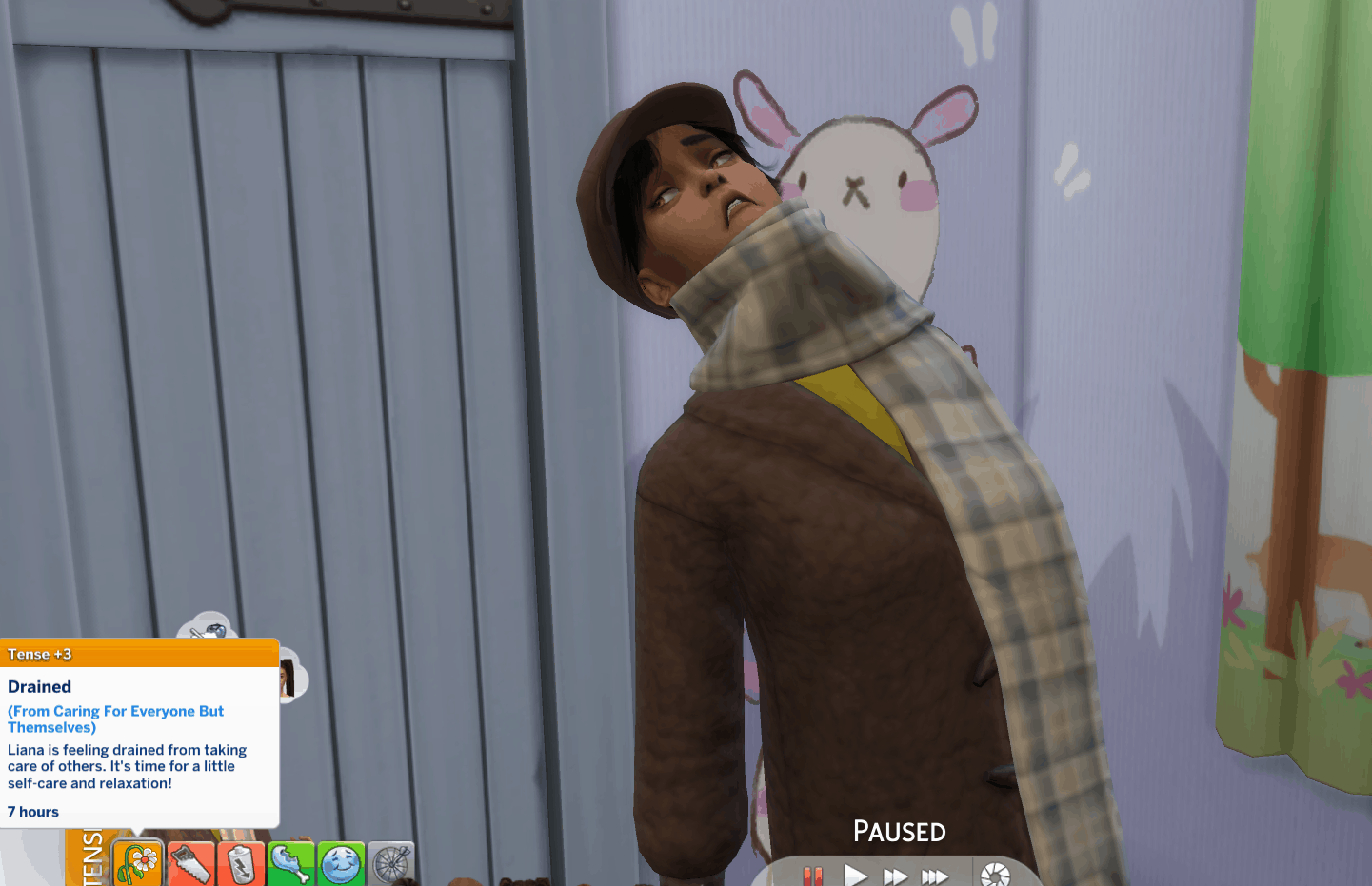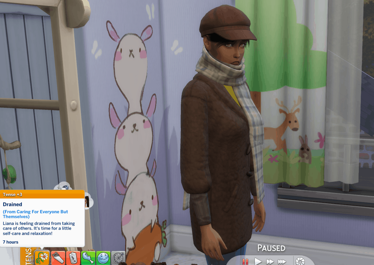 3. Drained: {0.SimFirstName} is feeling drained from taking care of others. It’s time for a little self-care and relaxation!