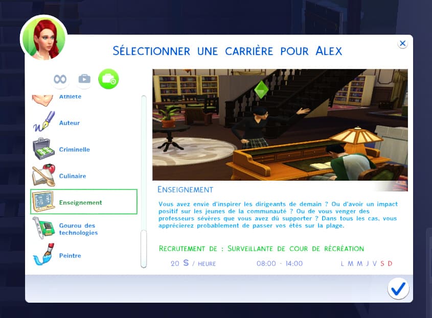 So… This is it ! A custom career for the Sims 4, inspired by the Education career from the Sims 3 Ambitions. The career is for young adult to elder and doesn’t have chance card. For now, it’s translated to English and French.