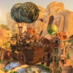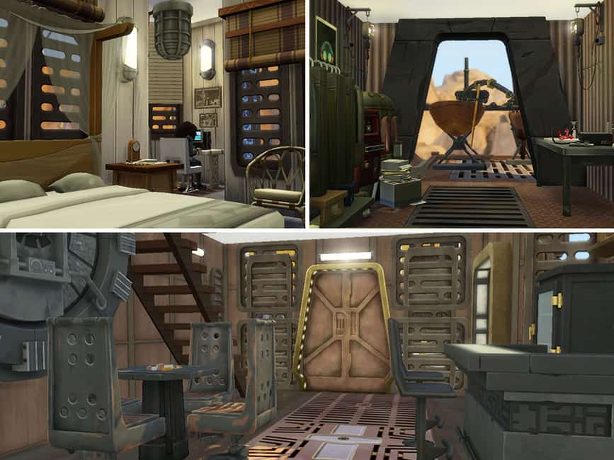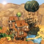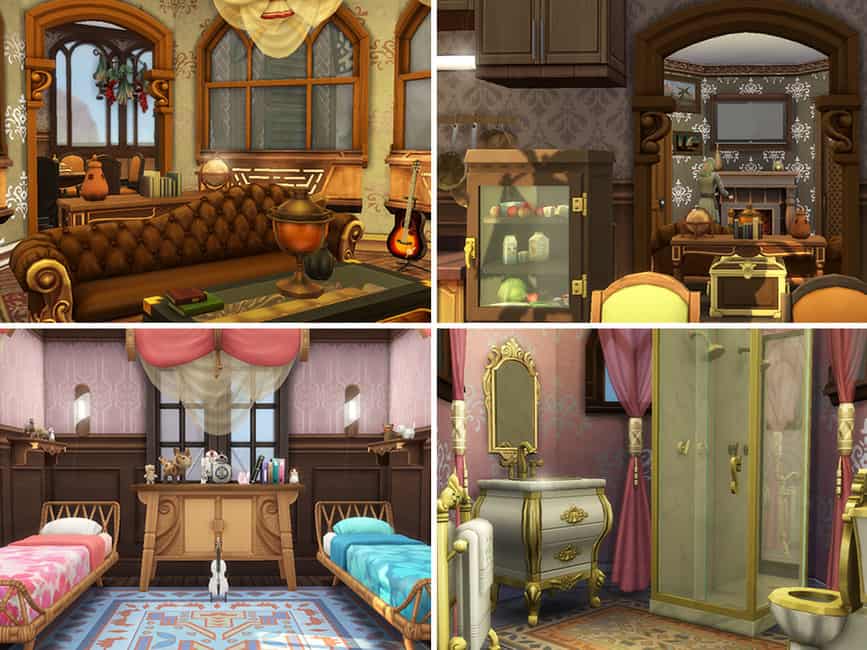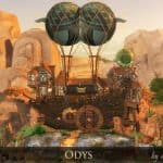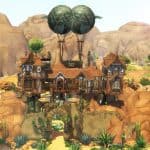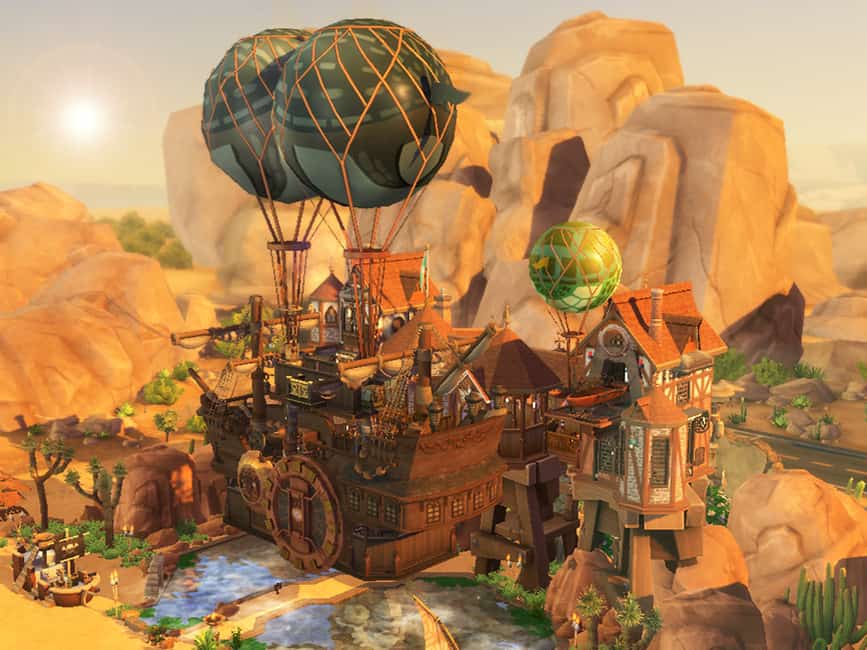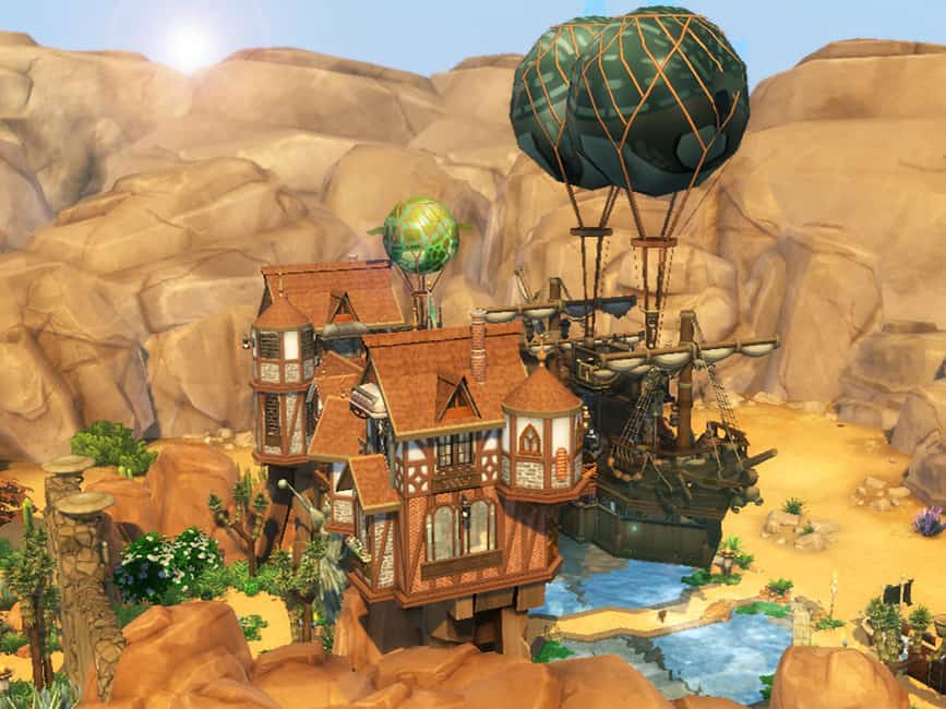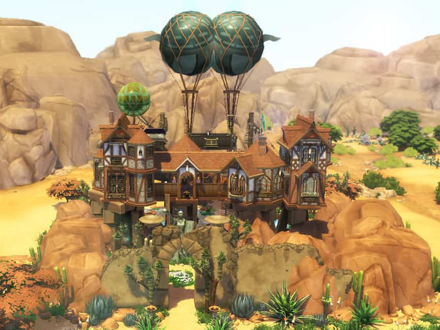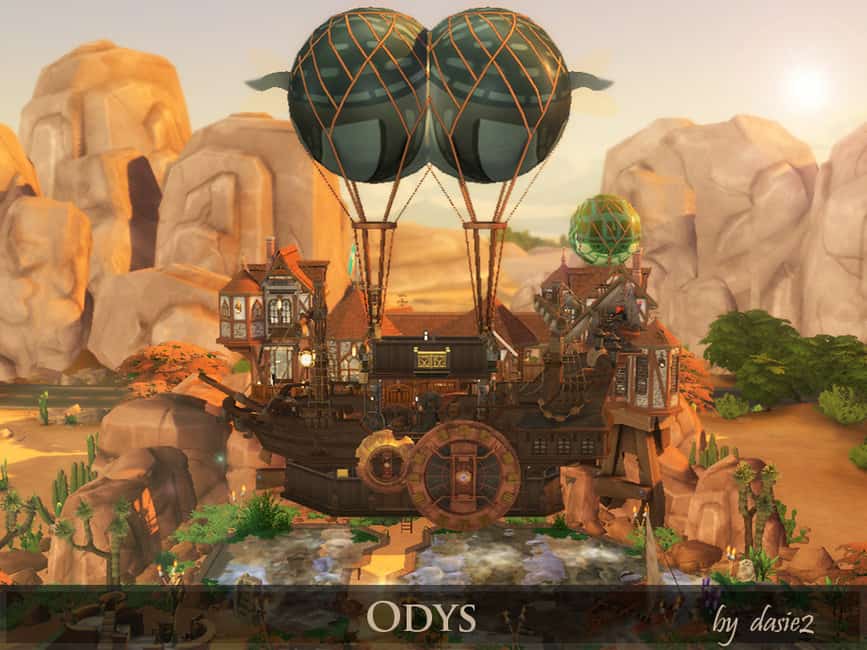 Odys is an amazing, steampunk Zeppelin docking next to snazzy Ithaca buildings. The house features a living room, a kitchen with a dininng, a play room, four bedrooms, five bathroom and many terraces, plus a beautiful garden with attractions. Please, use code bb.moveobjects on before you place this building. The lot was tested in the game.