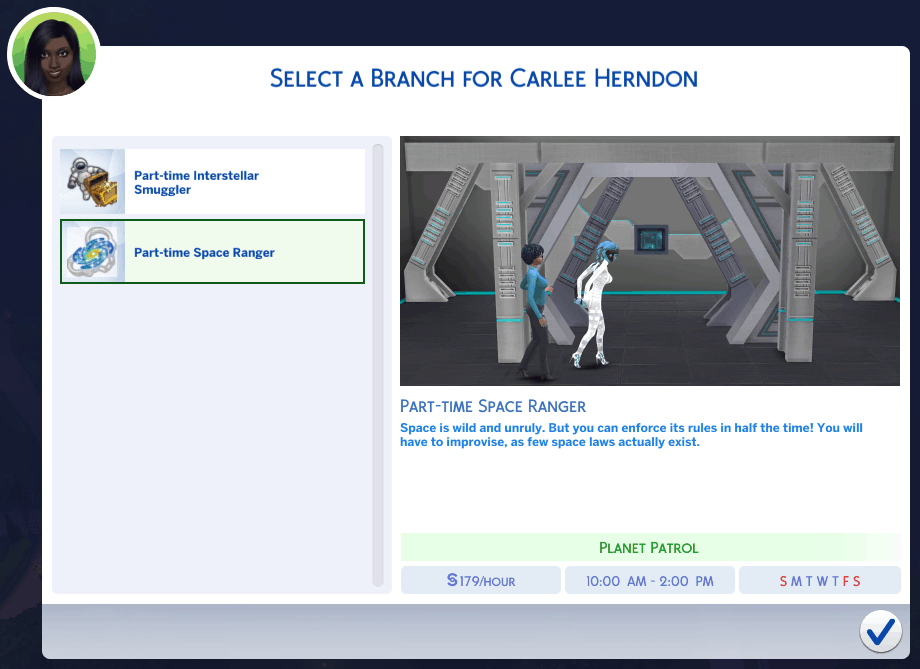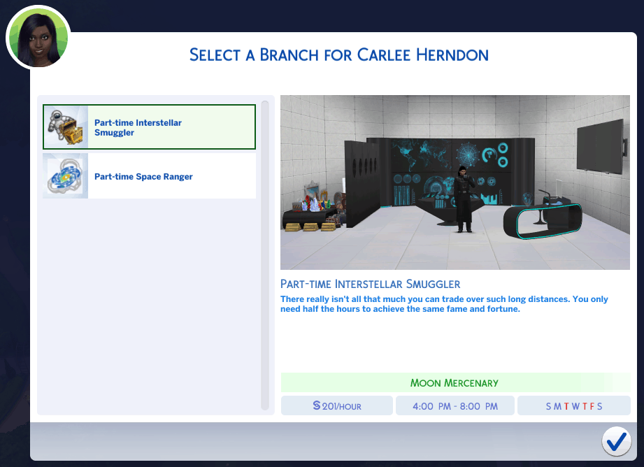 Job titles and career tracks are the same as in the base game. Per-hour salaries are the same, so Sims will make about half as much per day. The skill requirements are almost identical, but there are no task requirements. The hours are simply cut in half. The schedule is about the same (start time and days), but they’ll work e.g. 12pm-4pm, instead of 12pm-8pm.
