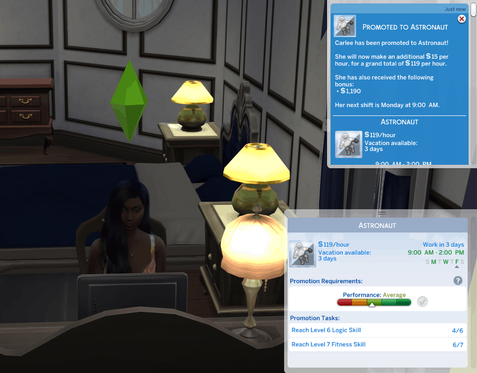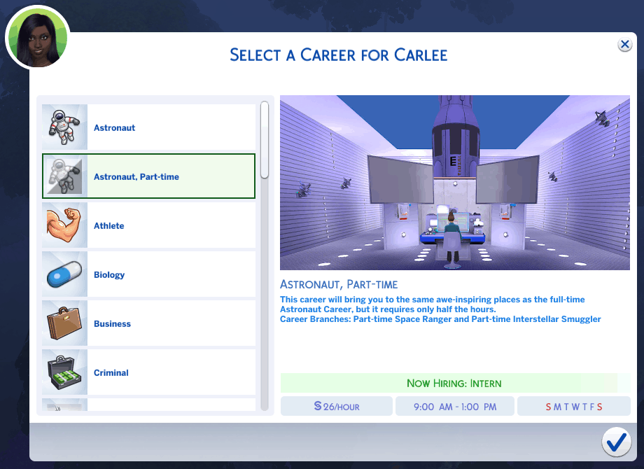 My Sims have way too many kids, so I was desperate for part-time careers. Someone suggested part-time versions of the pre-made careers, which I thought was brilliant. It’s simple; consistent with in-game experience; the balance of salary, skills, etc. is fool-proof. This one is my first: a part-time version of the base game Astronaut career.
