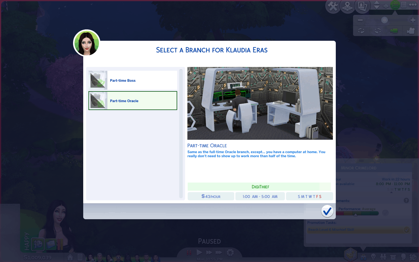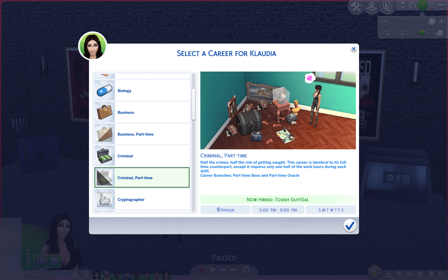 Half the crimes, half the risk of getting caught. This career is identical to its full-time counterpart, except it requires only one-half of the work hours.
