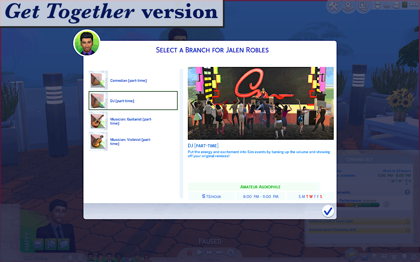 Version 2 – marked ‘GT’ – requires Get Together (it includes Version 1 + an extra branch, DJ, requiring the DJ skill).