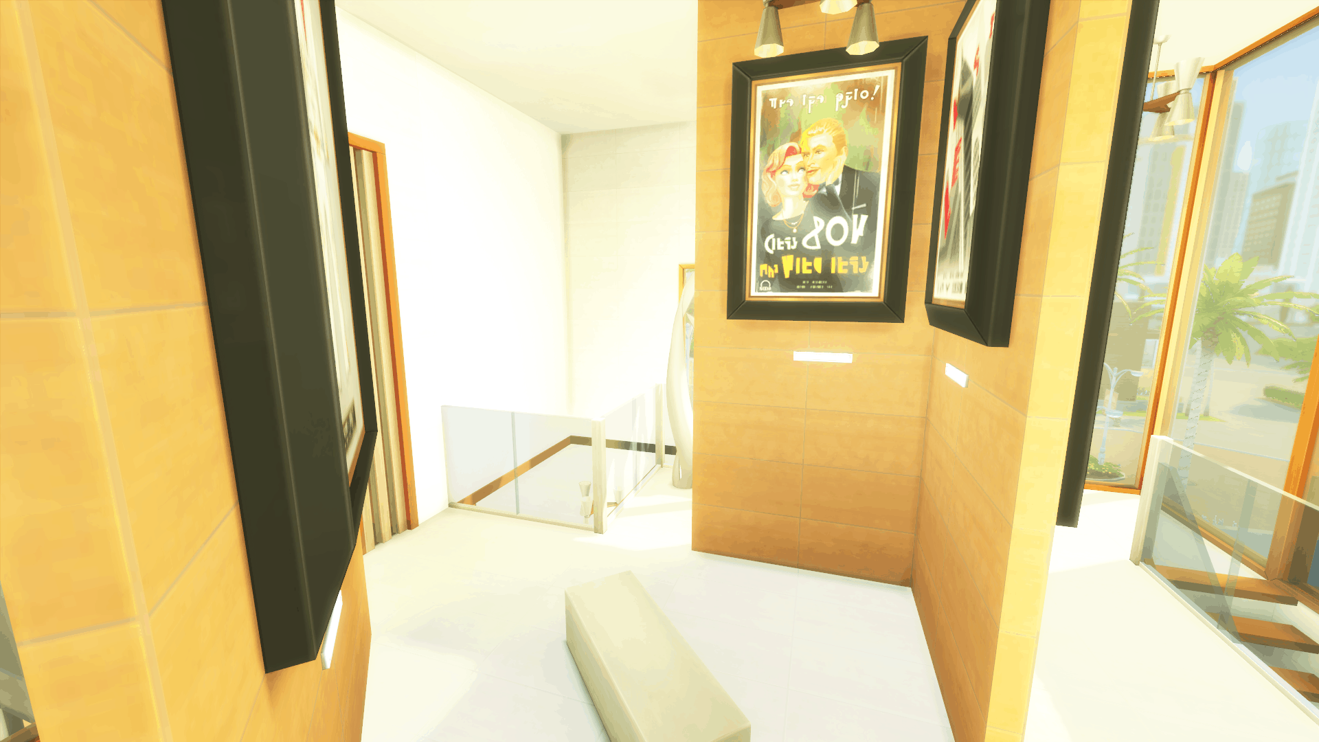 This new Plumbob Pictures Museum has three floors. The first and second floors are for framed movie posters, memorabilias, original art created for a certain movie, a prop hand used in a blockbuster Sim movie and a bunch of benches for your Sims to sit on while taking in all of the art.