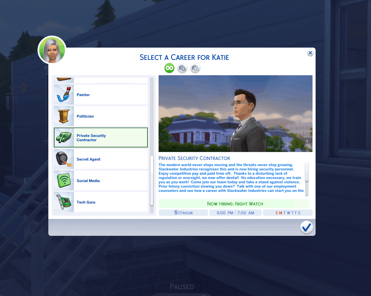 Just in case anyone felt that there weren’t enough careers already available for TS4, I present my first career creation – Private Security Contractor. I wanted to make a realistic career but with a bit of the same humor that is prevalent in The Sims.