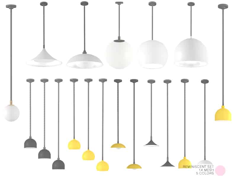 Reminiscent Retro Set. 14 Contemporary yet Retro ceiling lamps. High gloss finished lighting made of Glass with Metal fittings. Each ceiling lamp mesh with 5 colors in white, green, yellow, green and brown. Lighting By DOT of The Sims Resource.