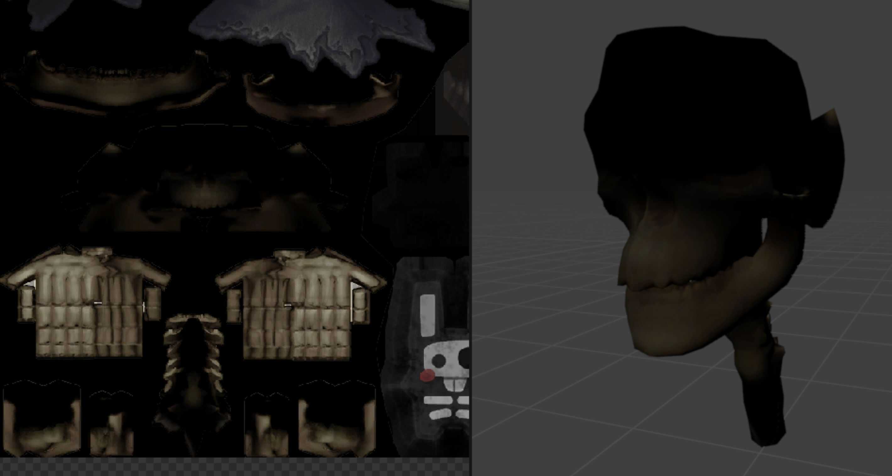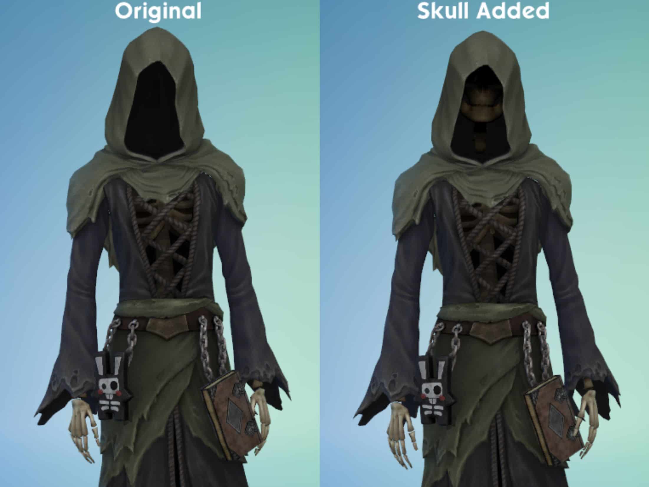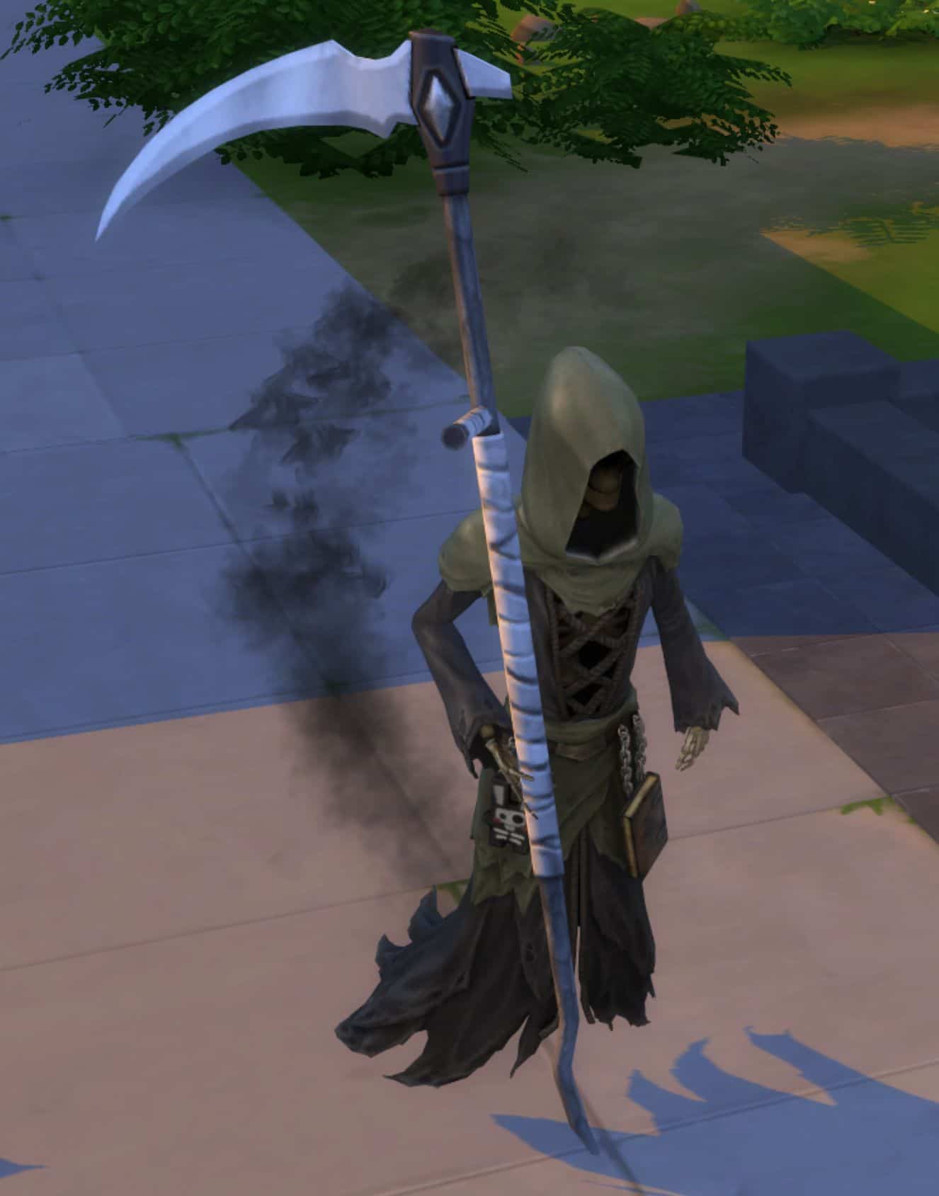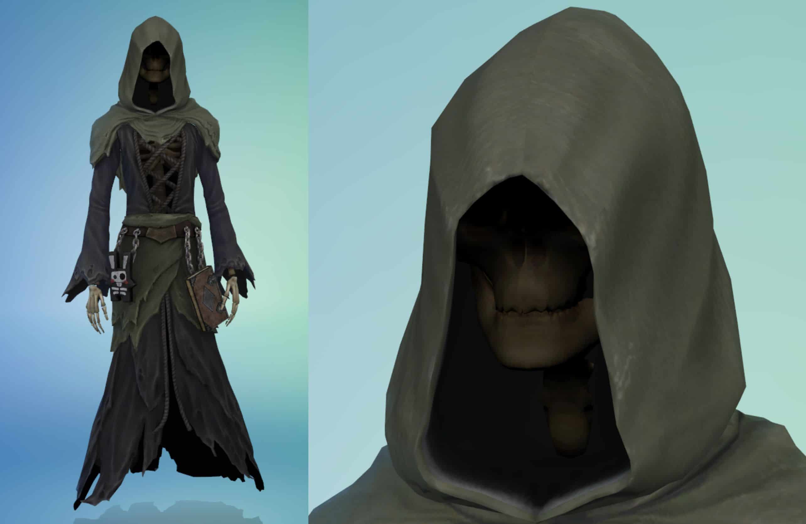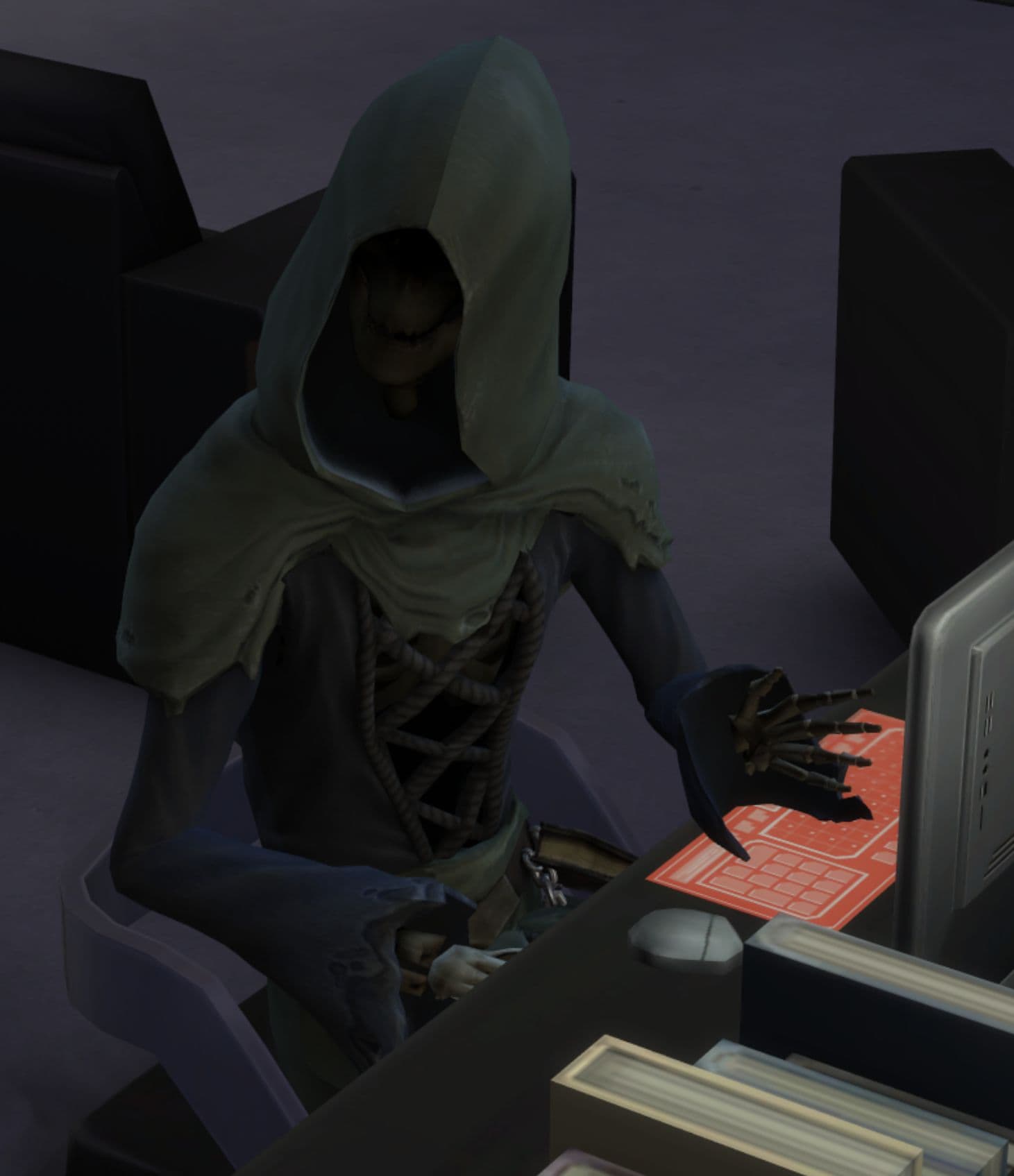 So if you weren’t aware yet, the January 2025 patch quietly gave a makeover to the Grim Reaper (later acknowledged in a subsequent patch), giving him a more skeletal appearance with boney hands and a visible ribcage. However, something else I discovered was that there’s also some unused sections in the texture files for a spooky shadowy skull, but with no meshes for it in the game files. This must’ve gotten scrapped at some point, probably because it goes against Grim’s typical look from most versions of The Sims.