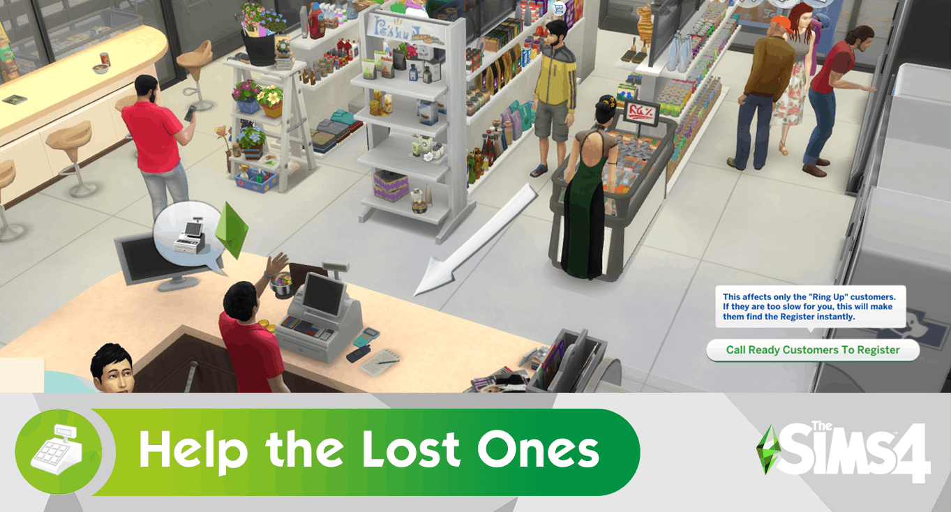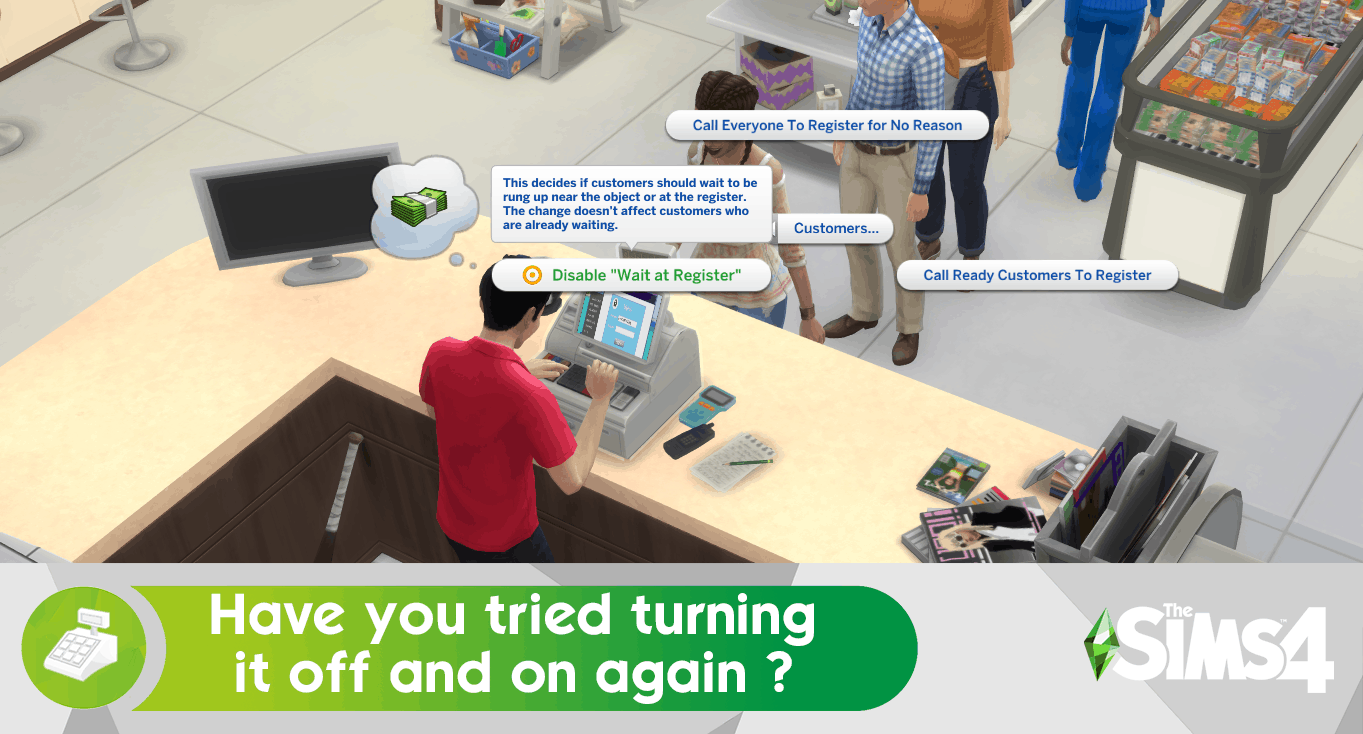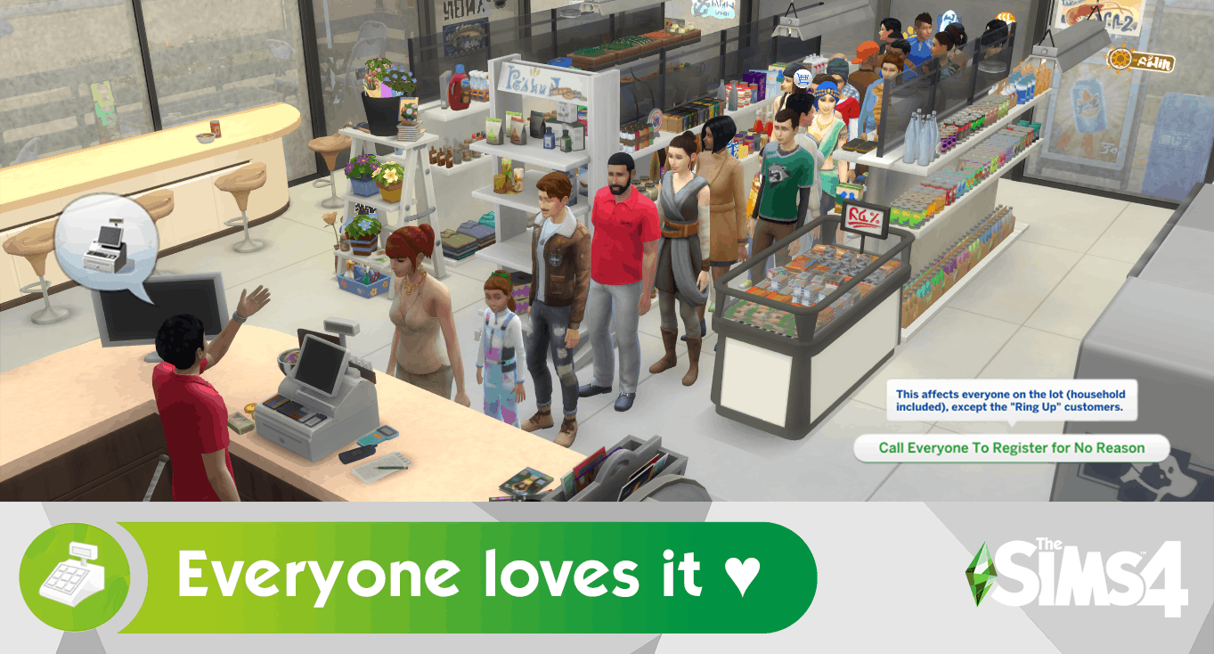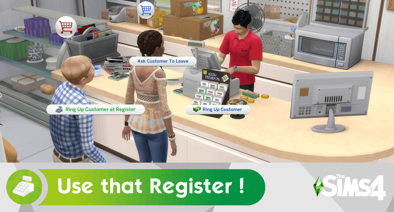 - As they are walking toward the register, the option to “Ring Up” customers is disabled. This is mainly to prevent overzealous employees from leaving the register and trying to ring them up halfway (and you know how well EA handles “try talking to moving sim”).