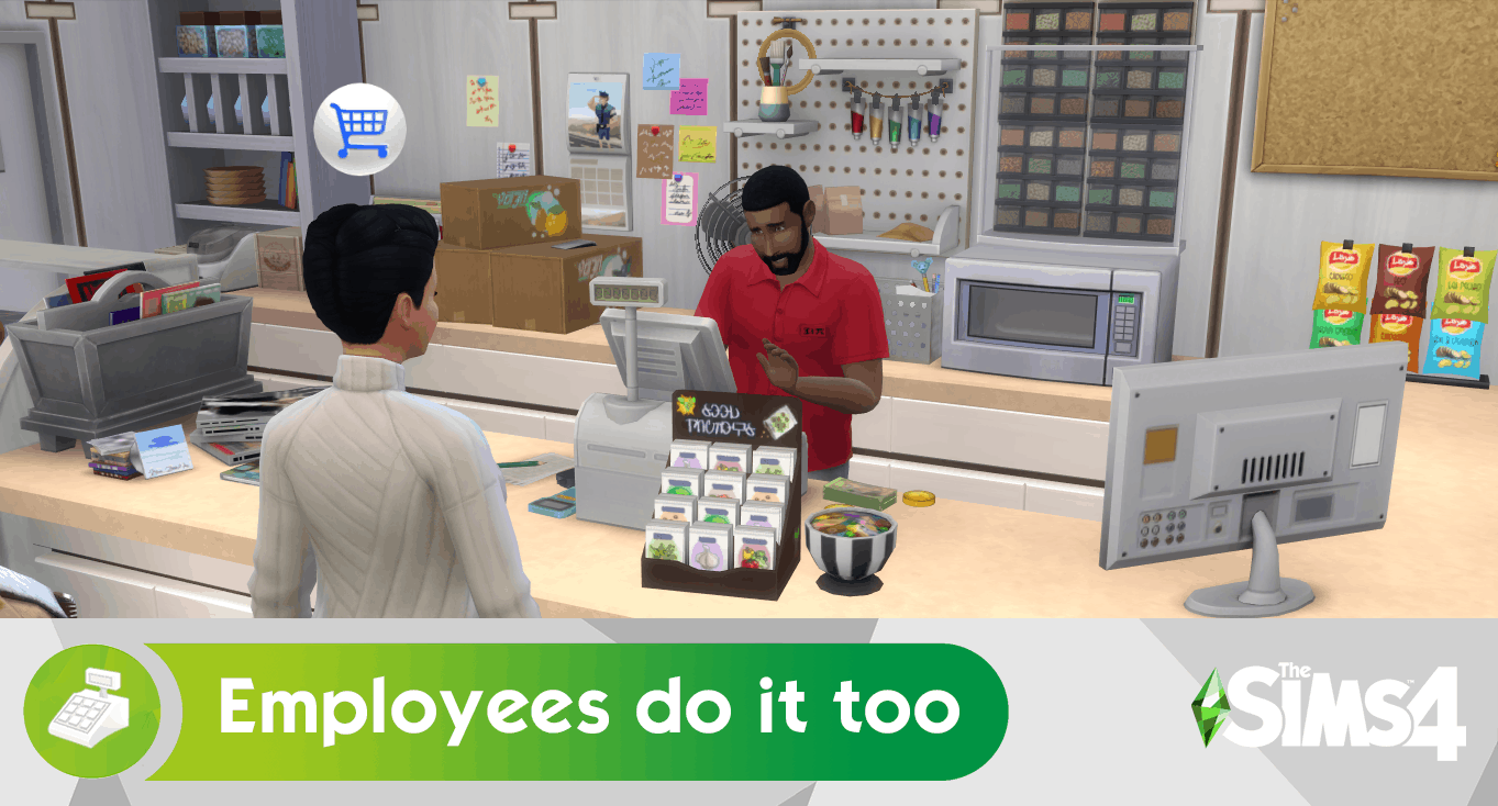 Employees, just like owners can “Ring Up” and “Ring Up at Register”. I didn’t specifically set a preference, so they might do both. I thought about making them only use “Ring Up at Register”, but I liked the variety in interactions. I did notice them going for the register more often but that’s EA’s default “do the less time-consuming / most rewarding thing”.