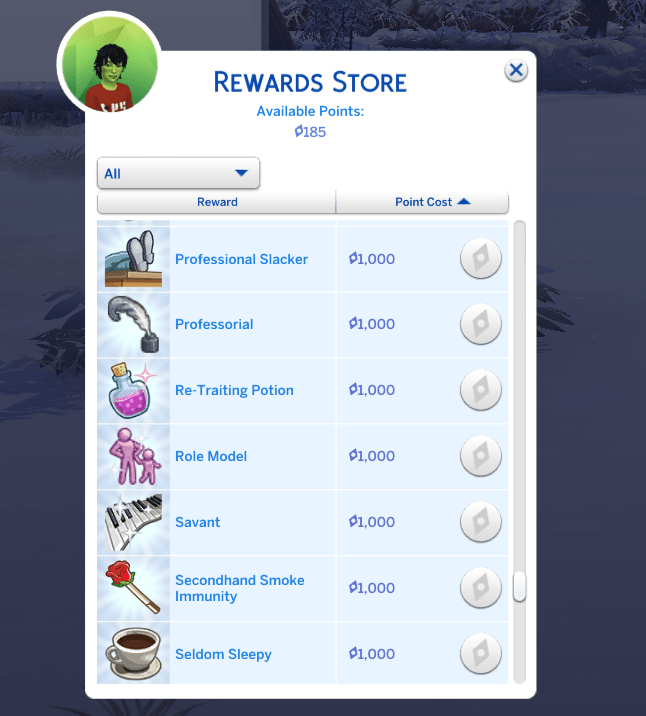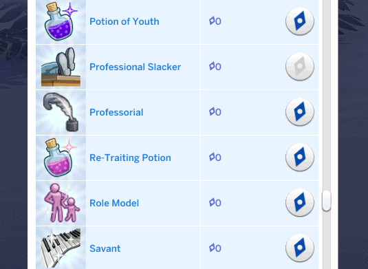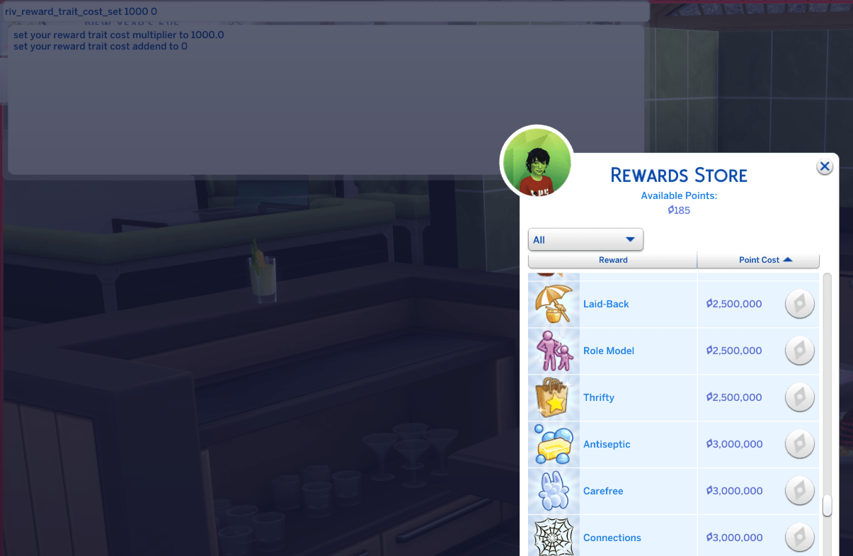 So… I love configuring things and my sims amass way too many satisfaction points. This mod lets you change the cost of every trait available in the reward store, including modded content! This has been created and tested for the v1.70.84 (Jan 21 / scared emotion) patch, with my apologies for the non-catchy name.