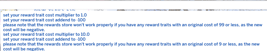 You can configure all reward trait costs with two variables – the multiplier m and the addend a. To get the new cost, the game will take the original cost, multiply it by m, round up, and then add a: