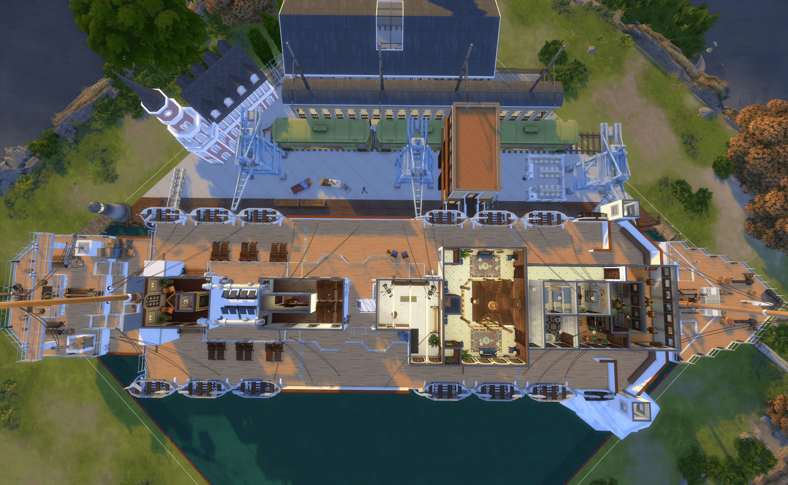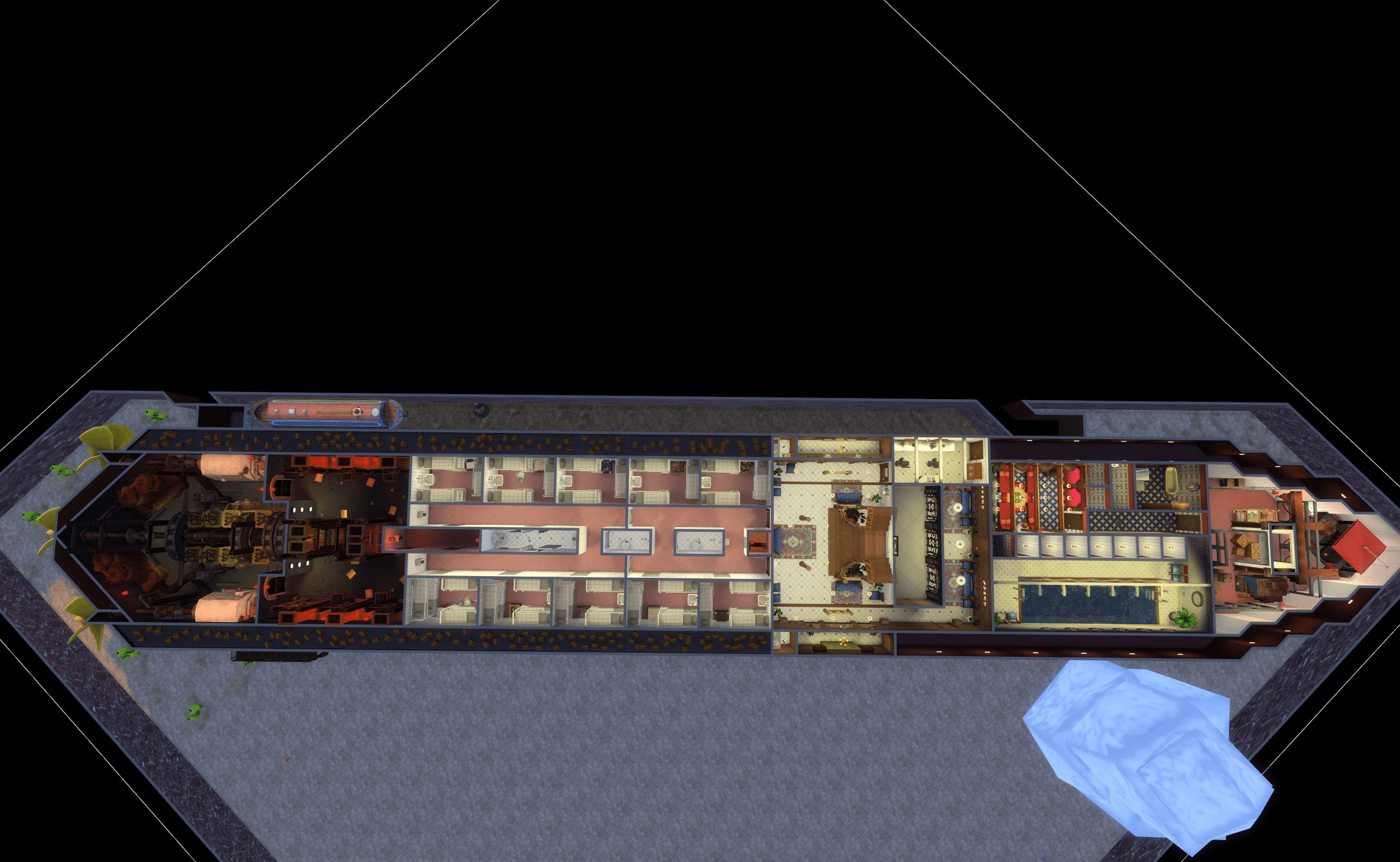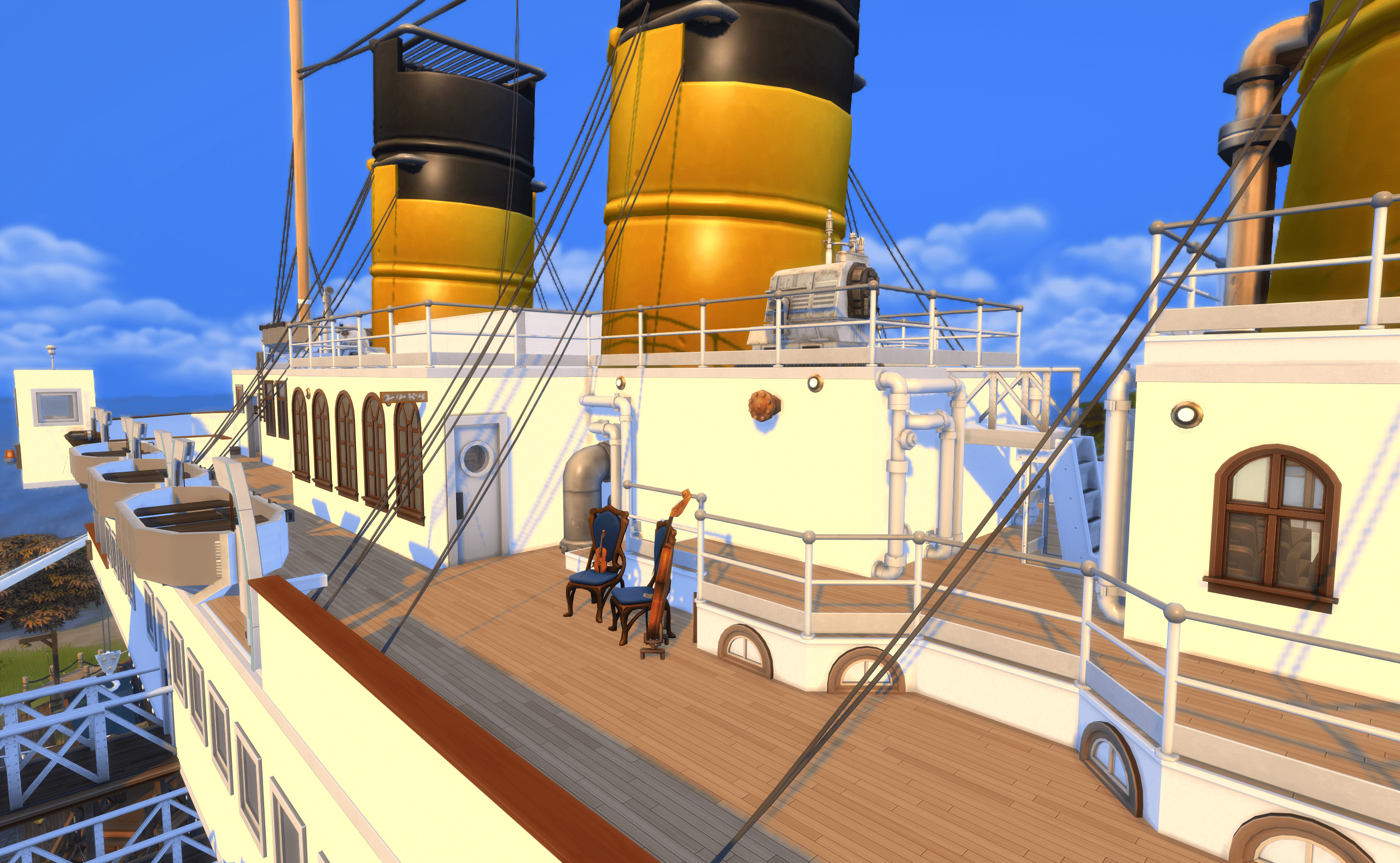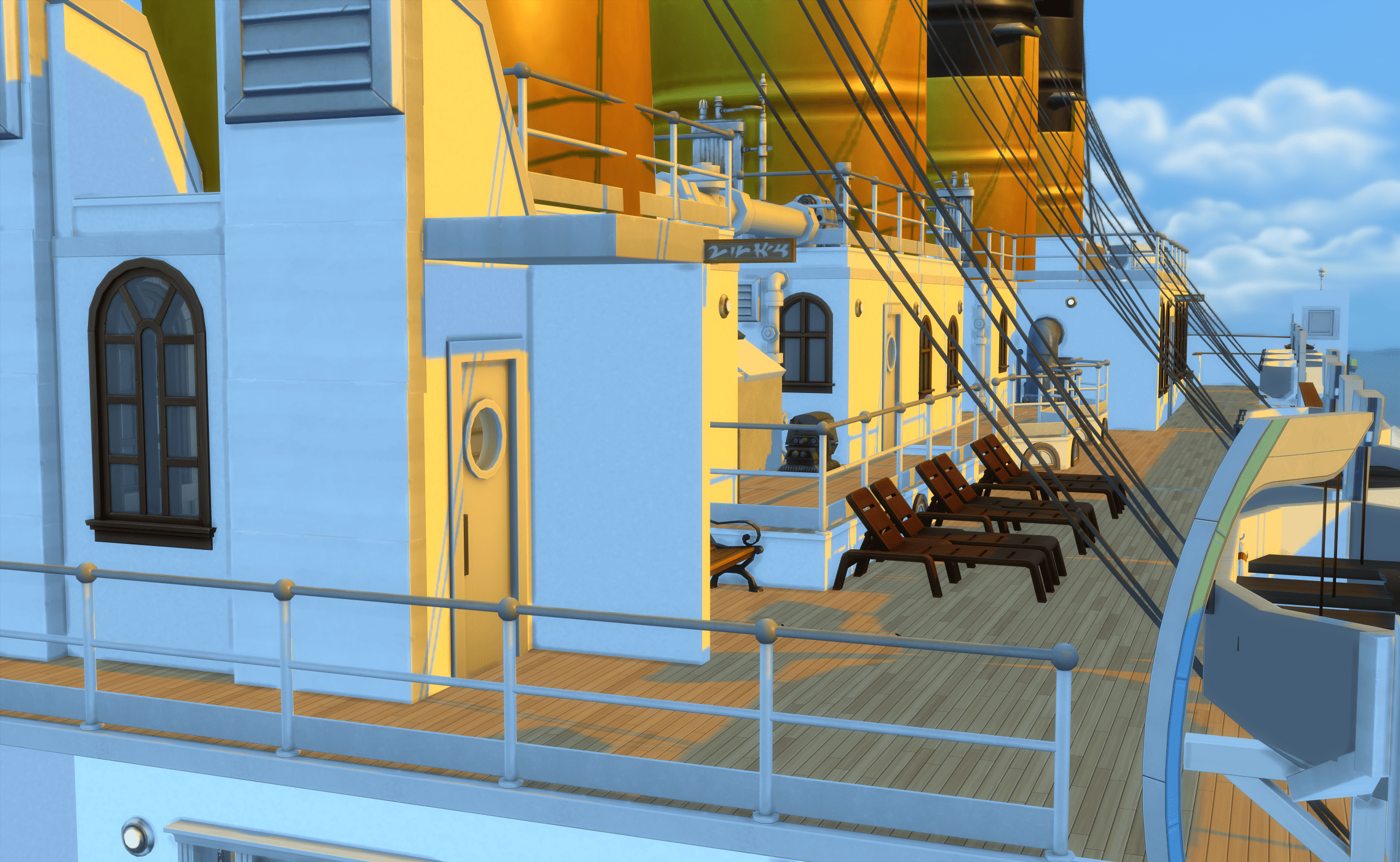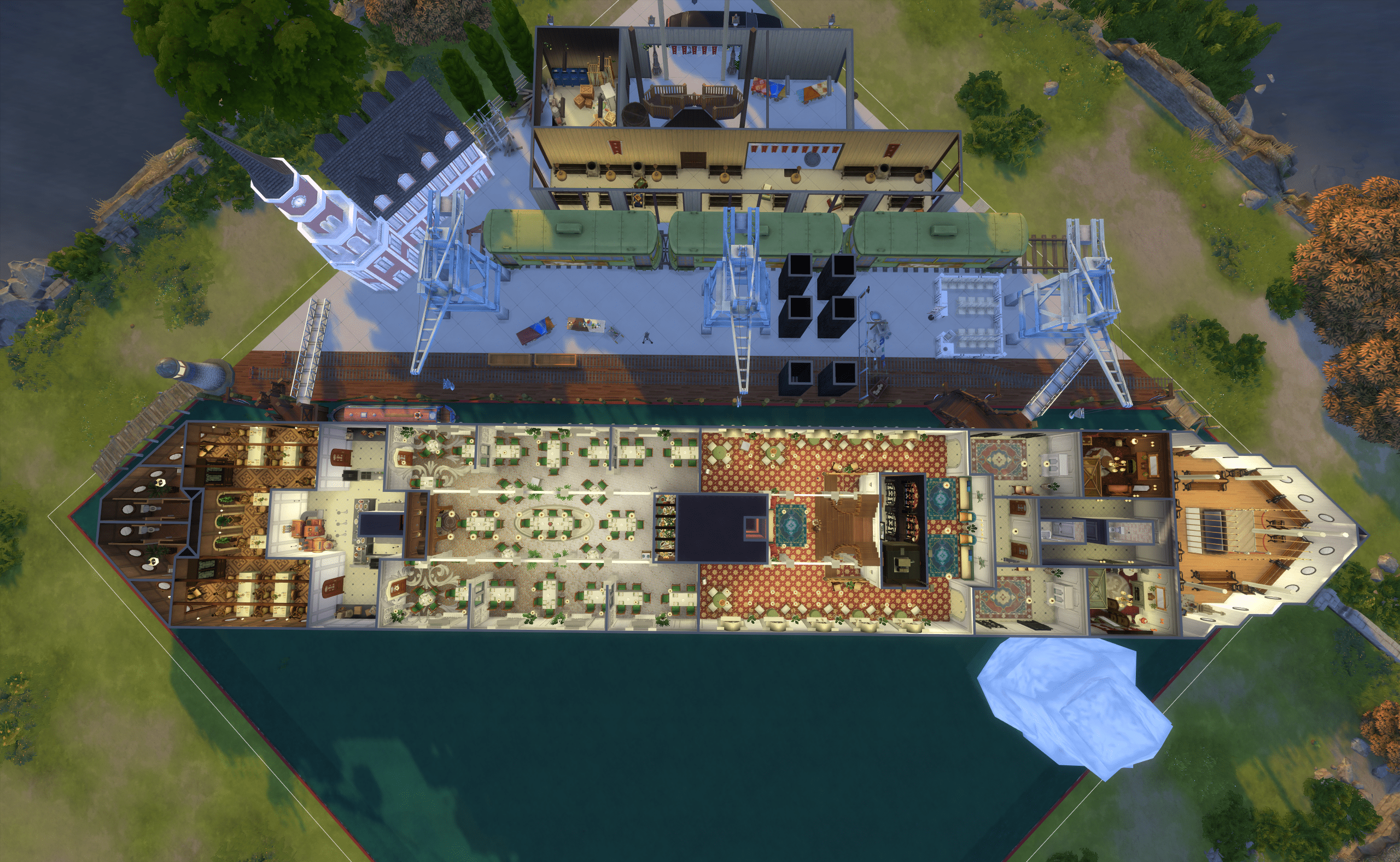 Relive history aboard the legendary ill-fated ocean liner, RMS Titanic. Meticulously and lovingly recreated room by room, this gigantic build will go on in our hearts… and on The Gallery… and ModTheSims. This titanic build features iconic rooms such as the Grand Staircase, First Class Lounge, First Class Smoking Room, Parisienne Cafe, Swimming Pool, Boiler Room and more, including her berth at Southampton! This build is my second Titanic build, following my 2008 Sims 2 Titanic Build! An earlier version of Sims 4 Titanic is available on The EA Gallery. It was originally built and uploaded to The Gallery in April 2021 to commemorate Titanic’s 107th anniversary of her sinking. In December 2021, I updated the build with rigging, minor fixes, and additional details, so she can live on, and I can live free of agony. I do plan on recreating scenes from the 1997 James Cameron film using this model. If you use this model, please tag me across social media, as I’d love to see how you explore and use my creation. I hope you enjoy this build, created with my entire heart and soul!