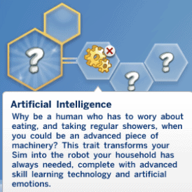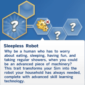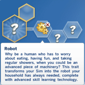 Behold, a new trait that can transform your ordinary Sim into a robot! Inspired by The Sims 3: Into the Future and these tattoos that make your Sim look like a robot. Robots build skills 2x as fast as regular Sims and have needs that never decay (which needs never decay depends on the flavor you choose). This mod comes in five flavors: Robot, Sleepless Robot, Hybrid Robot, Artificial Intelligence, and Sleepless Artificial intelligence. You can have multiple installed at once, but don’t give multiple robot traits to one sim.