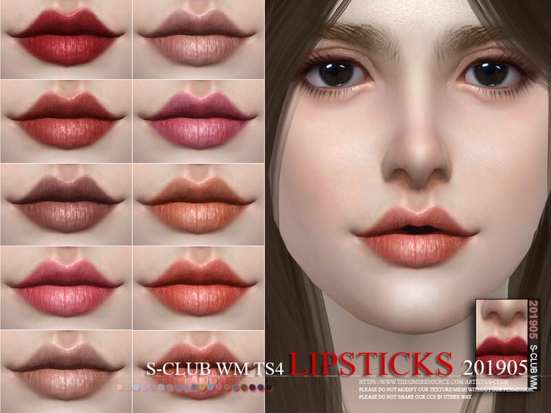 Our database contains only the highest quality Sims 4 mods that meet the most stringent requirements, like S-Club WM ts4 Lipstick 201905 Sims 4 Mod. This guarantees that our visitors have access to the most exclusive and useful files.