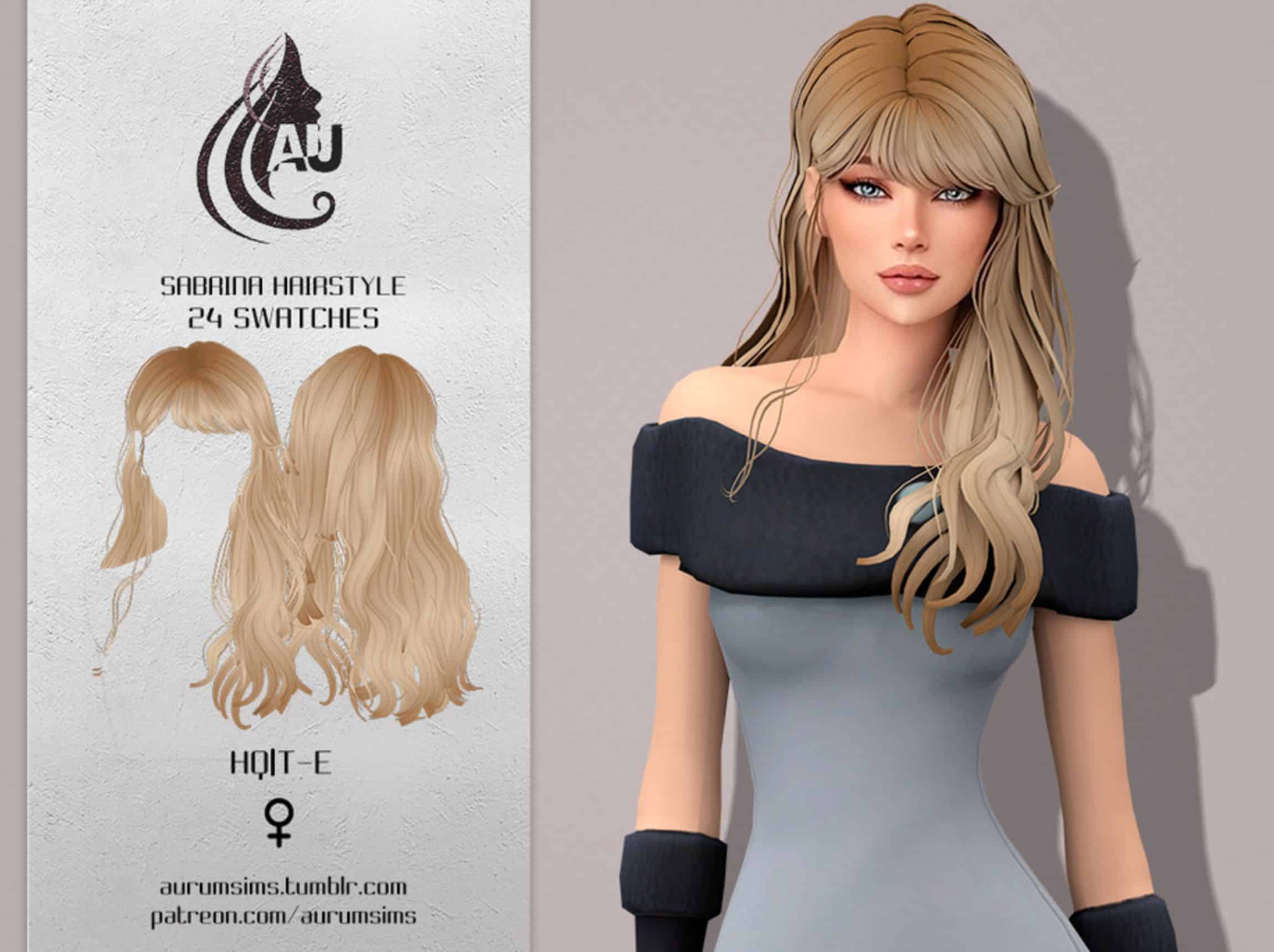 Maxis match long wavy hair with bangs in 24 EA swatches for female teen-elder sims by Aurum for The Sims 4.