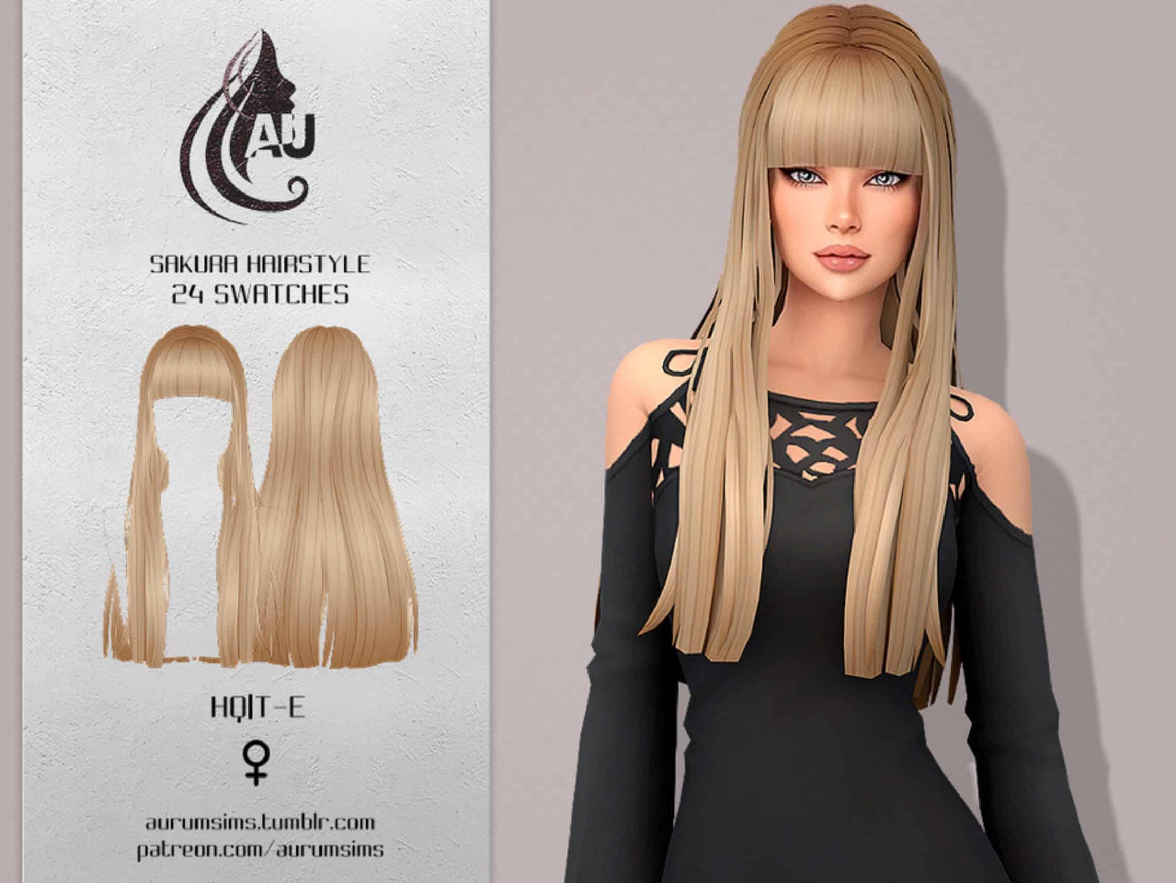Maxis match long straight hair with bangs in 24 EA swatches for female teen-elder sims by Aurum for The Sims 4.