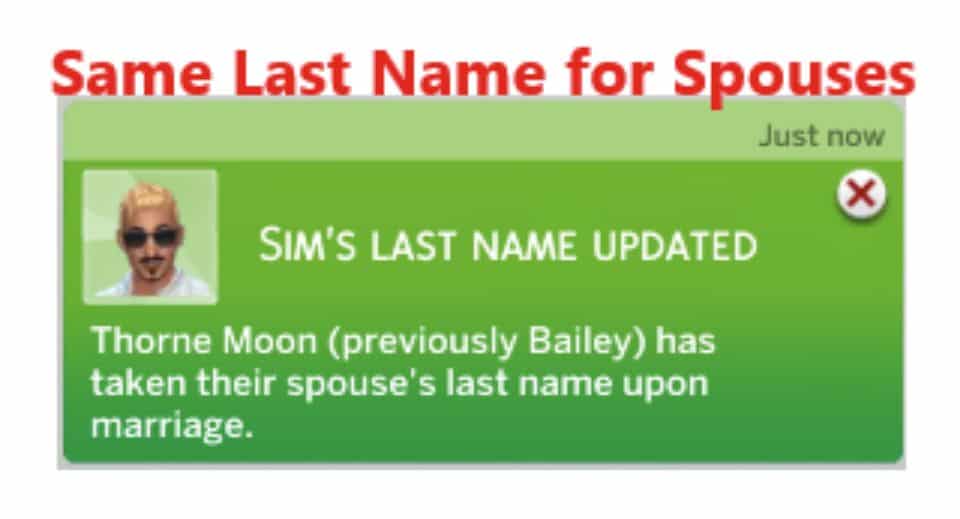 Three versions to choose from: patriarchal, matriarchal or senior. Patriarchal will prioritize male’s last name and matriarchal female’s last name. These first two versions only work for heterosexual couples. Senior version will update last names to oldest sim’s name and works for all couples.