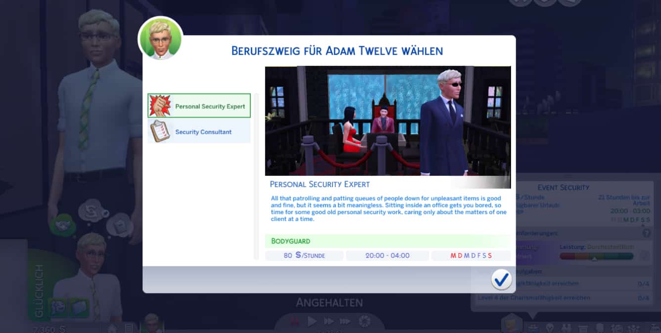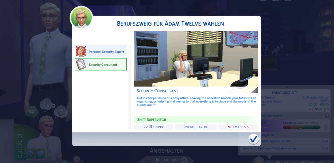 It has 10 levels and 2 promotion tracks: security consultant and personal security expert. The pay is roughly maxis standard, and it follows the slightly humorous tradition when it comes to the texts i’ve used – that’s also a reason why it’s nightshift only. (vampire friendly, yay!)
