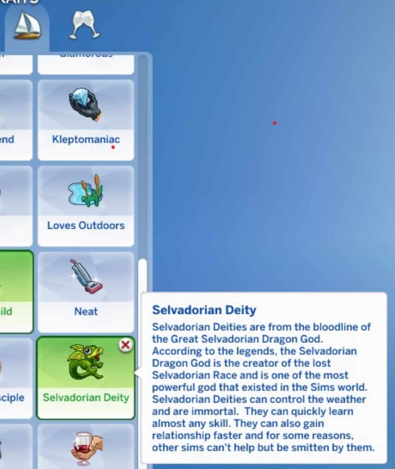 Selvadorian Deities are from the bloodline of the Great Selvadorian Dragon God. According to the legends, the Selvadorian Dragon God is the creator of the lost Selvadorian Race and is one of the most powerful god that existed in the Sims world. Selvadorian Deities can control the weather and are immortal. They can quickly learn almost any skill. They can also gain relationship faster and for some reasons, other sims can’t help but be smitten by them.