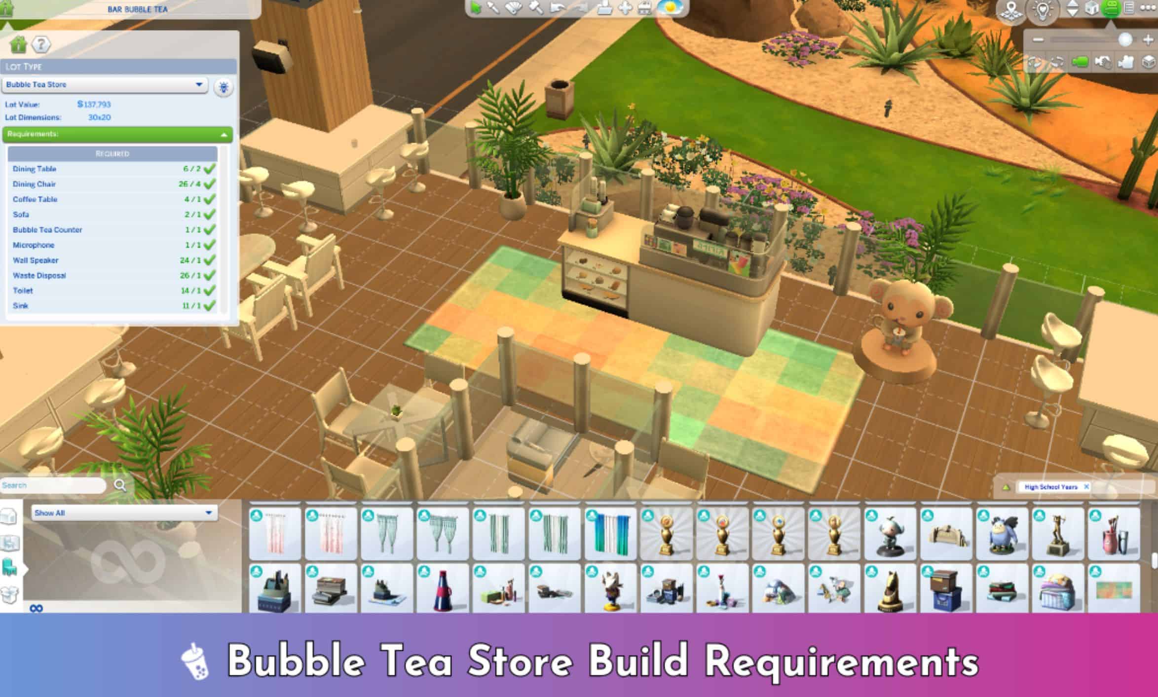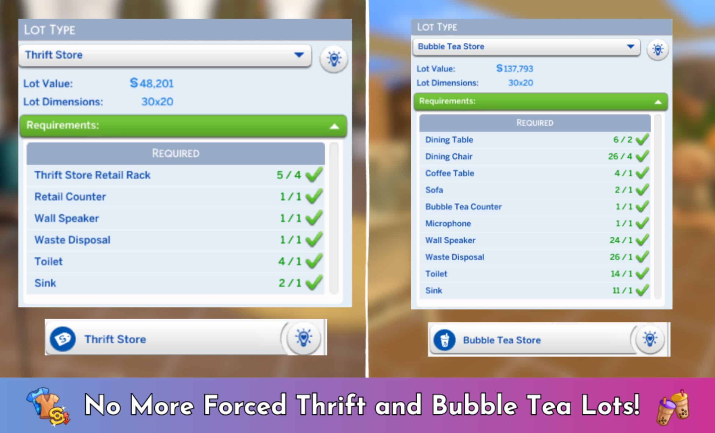 Both Lots will have their own build requirements and will function as usual. Thrift Store lots will still have the store owner, customers, and enthusiasts appear. The Bubble Tea stores will have a barista and customers will still visit the lot.