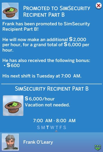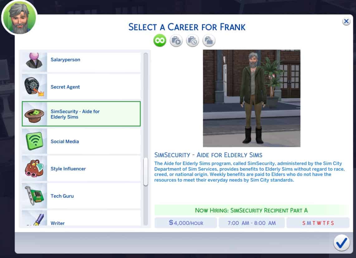 -SimSecurity – The Aide for Elderly Sims program, called SimSecurity, administered by the Sim City Dept. of Sim Services, provides benefits to elderly Sims without regard to race, creed, or national origin. Weekly benefits are paid to elders who do not have the resources to meet their everyday needs by Sim City standards.